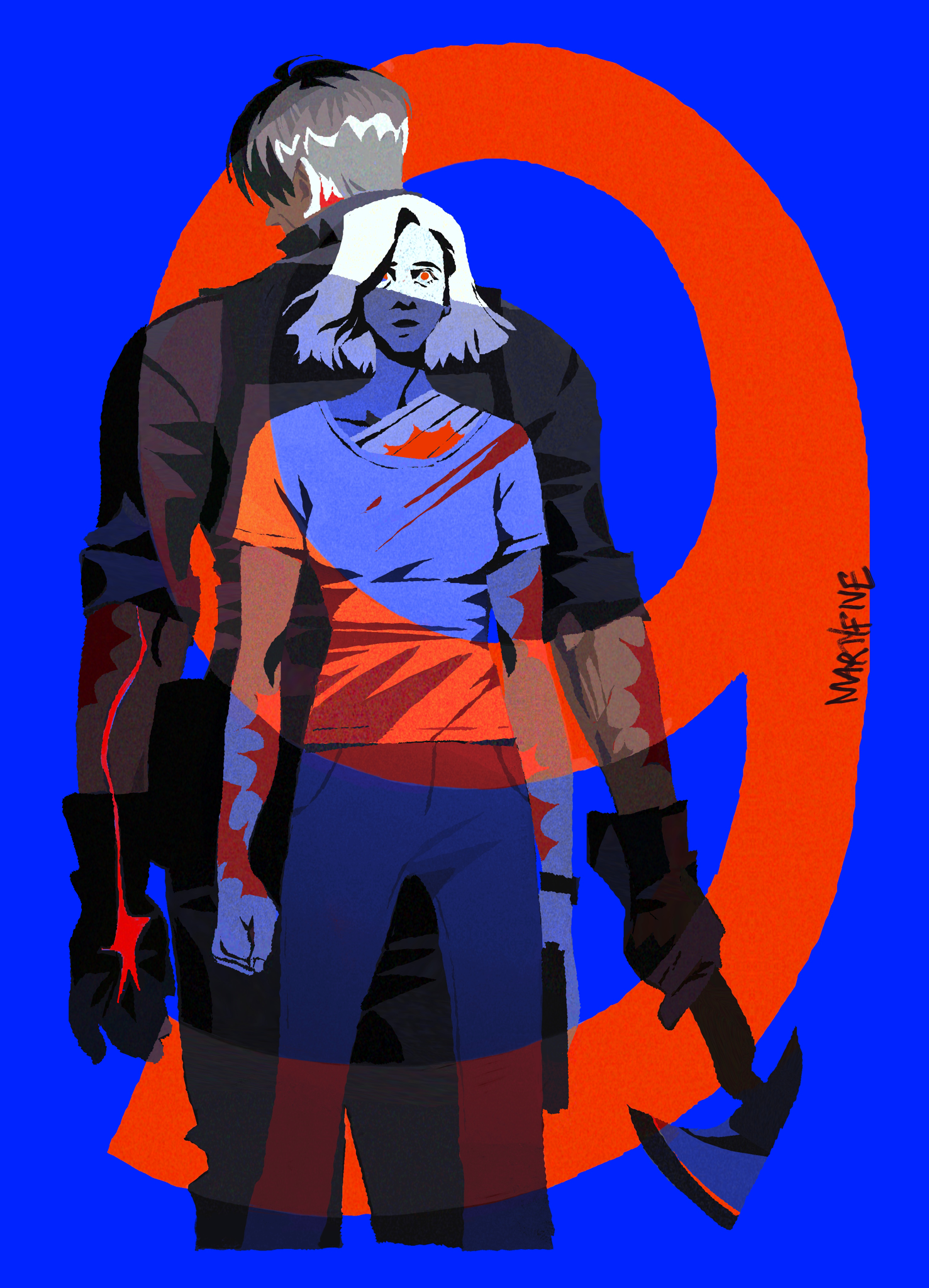 1boy 1girl axe back-to-back black_gloves blood blood_on_arm blood_on_clothes breasts commentary english_commentary gloves grace_ashcroft gun handgun hatchet_(axe) highres holding holding_axe holding_gun holding_weapon leon_s._kennedy limited_palette martyfive pants red_eyes resident_evil resident_evil_requiem shirt signature sleeves_rolled_up small_breasts t-shirt weapon