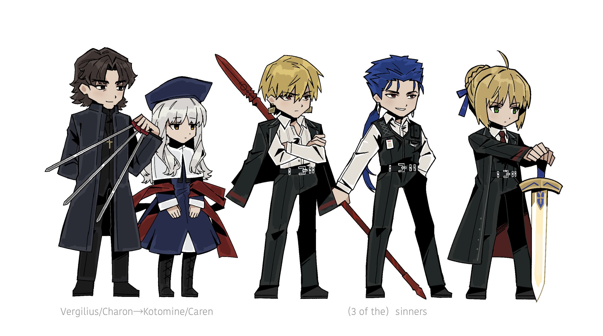 2girls 3boys ahoge airsgravity alternate_costume artoria_pendragon_(fate) black_coat black_jacket black_pants blonde_hair brown_hair caren_hortensia closed_mouth coat collared_shirt commentary cu_chulainn_(fate) cu_chulainn_(fate/stay_night) cu_chulainn_(lancer)_(fate) excalibur_(fate/stay_night) fate/stay_night fate_(series) gae_bolg_(fate) gilgamesh_(fate) green_eyes hair_bun highres holding holding_polearm holding_weapon jacket jacket_on_shoulders kotomine_kirei lcb_uniform_(project_moon) limbus_company multiple_boys multiple_girls necktie pants parody polearm project_moon red_necktie saber_(fate) shirt simple_background style_parody weapon white_background white_shirt