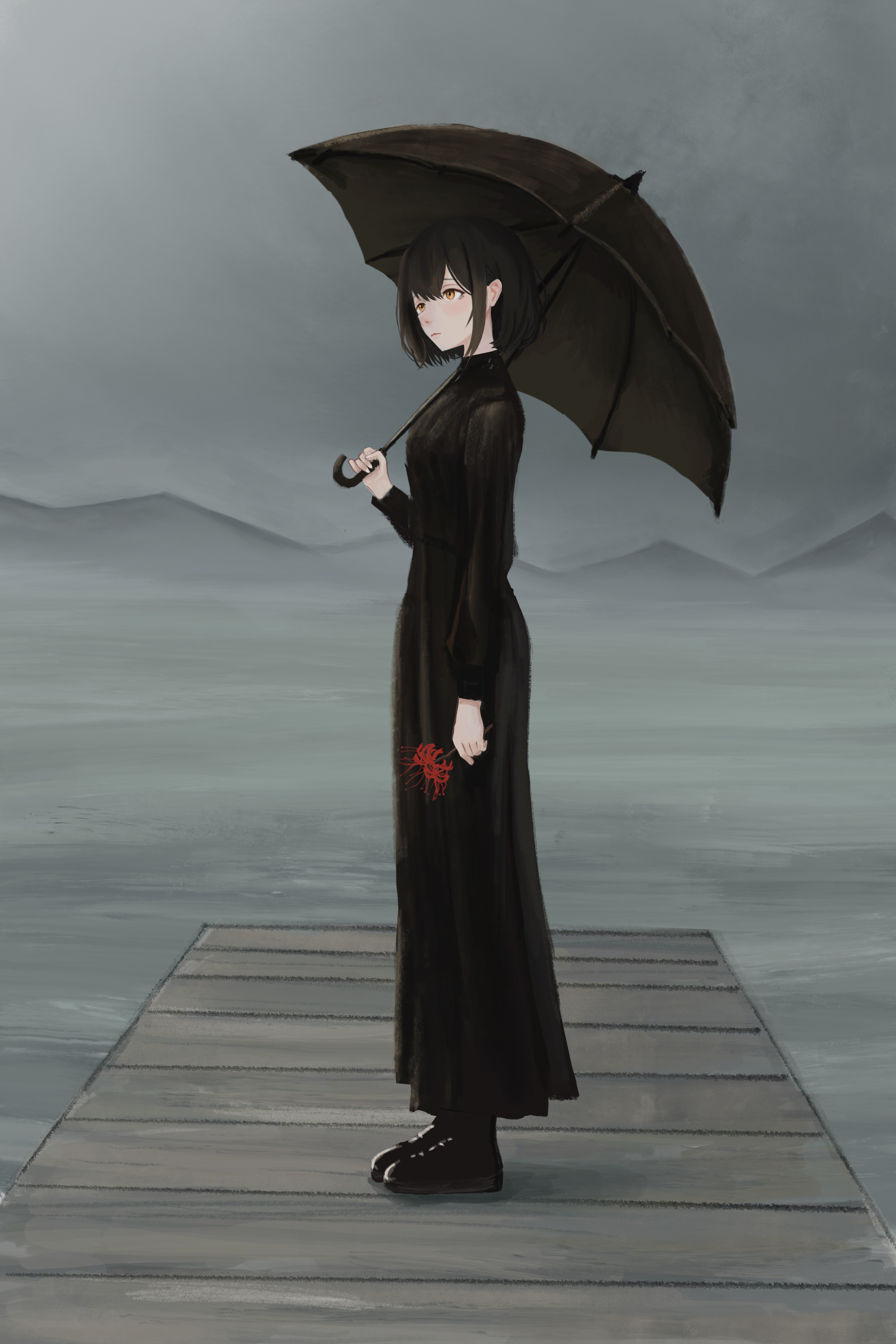 1girl absurdres black_shoes black_umbrella diky dress flower from_side full_body hair_behind_ear highres holding holding_flower holding_umbrella long_dress long_sleeves mountainous_horizon orange_eyes original outdoors puffy_long_sleeves puffy_sleeves red_flower shoes solo spider_lily standing umbrella water wooden_deck