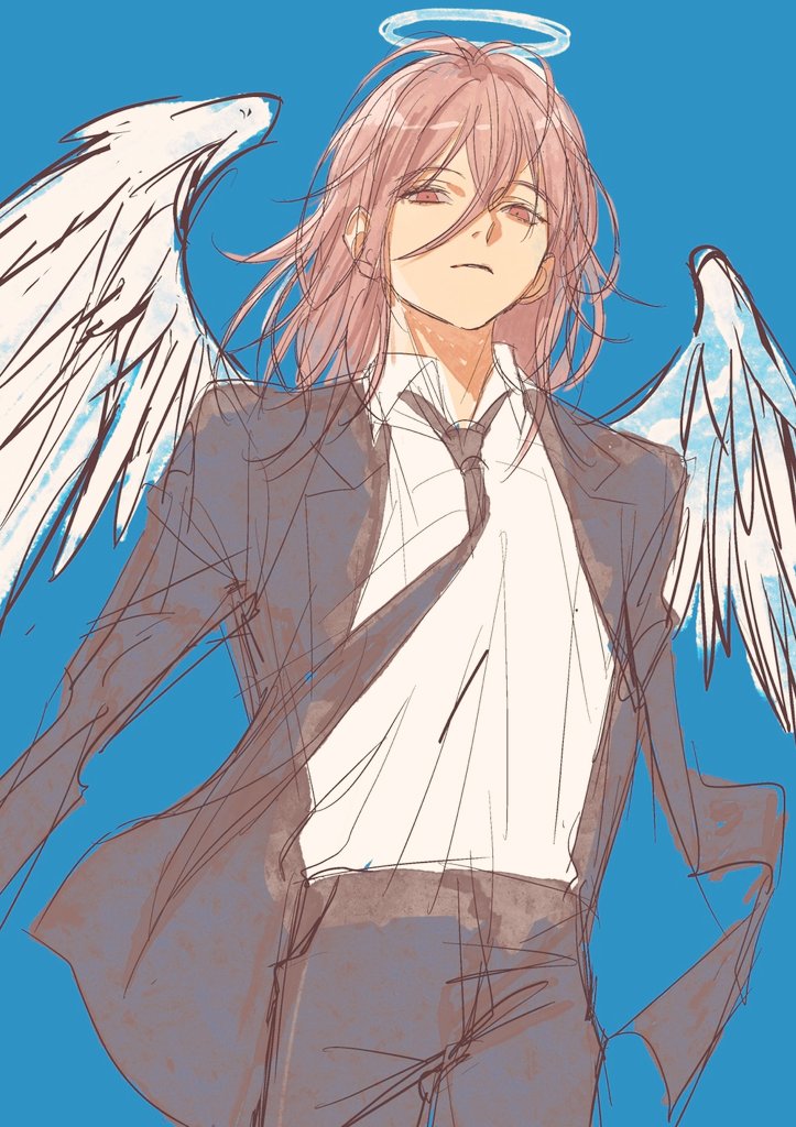 1boy amputee angel angel_devil_(chainsaw_man) angel_wings black_jacket black_necktie black_pants blue_background chainsaw_man closed_mouth collared_shirt commentary_request double_amputee from_below hair_between_eyes halo jacket long_hair male_focus necktie neus_se pants shirt shirt_tucked_in simple_background sketch solo spread_wings suit_jacket traditional_halo white_shirt wings