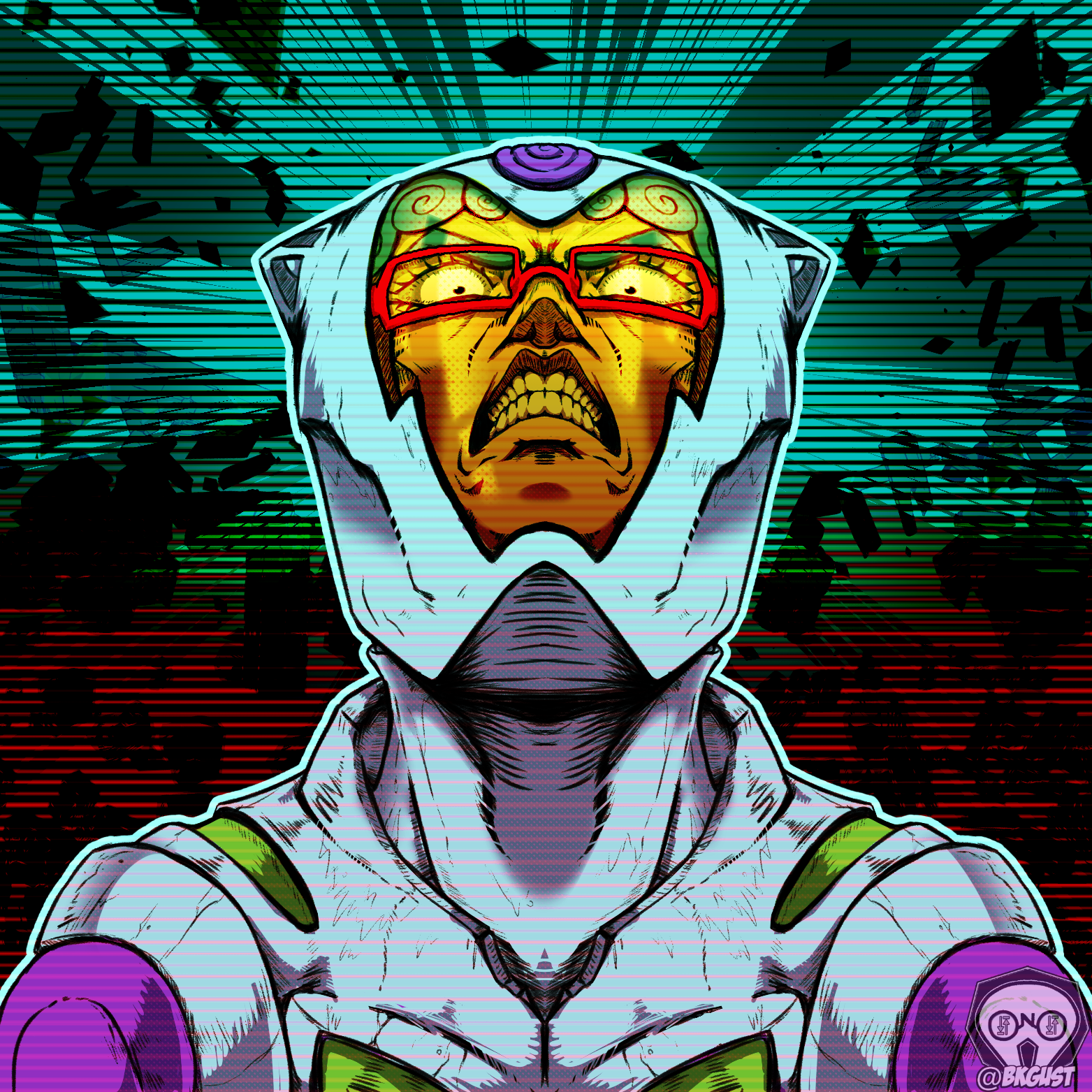 1boy angry aqua_hair armor artist_name clenched_teeth commentary curly_hair debris english_commentary ghiaccio glasses gustbk highres jojo_no_kimyou_na_bouken looking_at_viewer red-framed_eyewear scanlines short_hair solo stand_(jojo) teeth vento_aureo white_album_(stand)