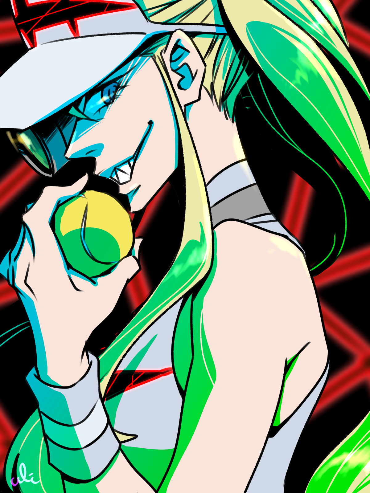 1girl artist_name ball blonde_hair blue_eyes choker commentary_request from_side grin hakodate_omiko hat highres holding kill_la_kill long_hair looking_at_viewer patterned_background ponytail scope sharp_teeth sidelocks signature smile solo sportswear teeth tennis_ball tennis_uniform uri_(20130828) visor_cap white_hat