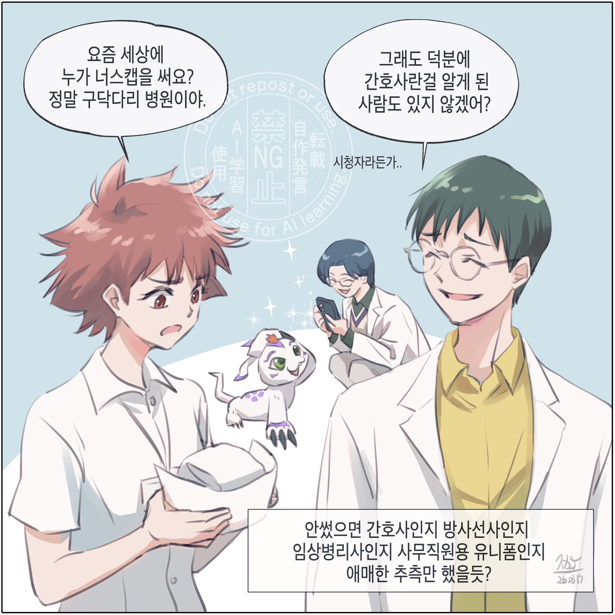 cellphone digimon digimon_adventure digimon_adventure_-beyond- gomamon green_eyes happy hat kido_jo kido_shin korean_text looking_at_another motomiya_jun nurse nurse_cap phone pqtiger smartphone smile translation_request