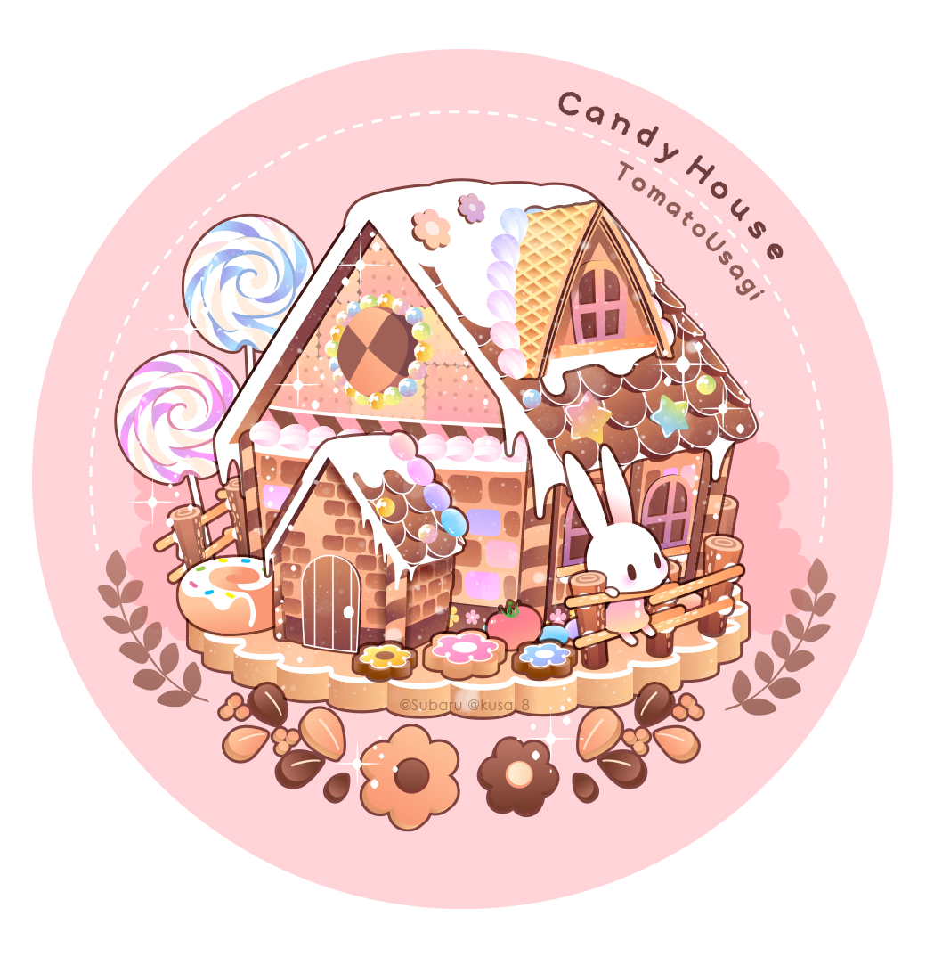 artist_name blush border candy checkerboard_cookie chibi cinnamon_roll commentary_request cookie food food_focus gingerbread_house lollipop no_humans original pink_background rabbit round_border sparkle sparkling_aura star_(symbol) subaru_(jack) swirl_lollipop white_border