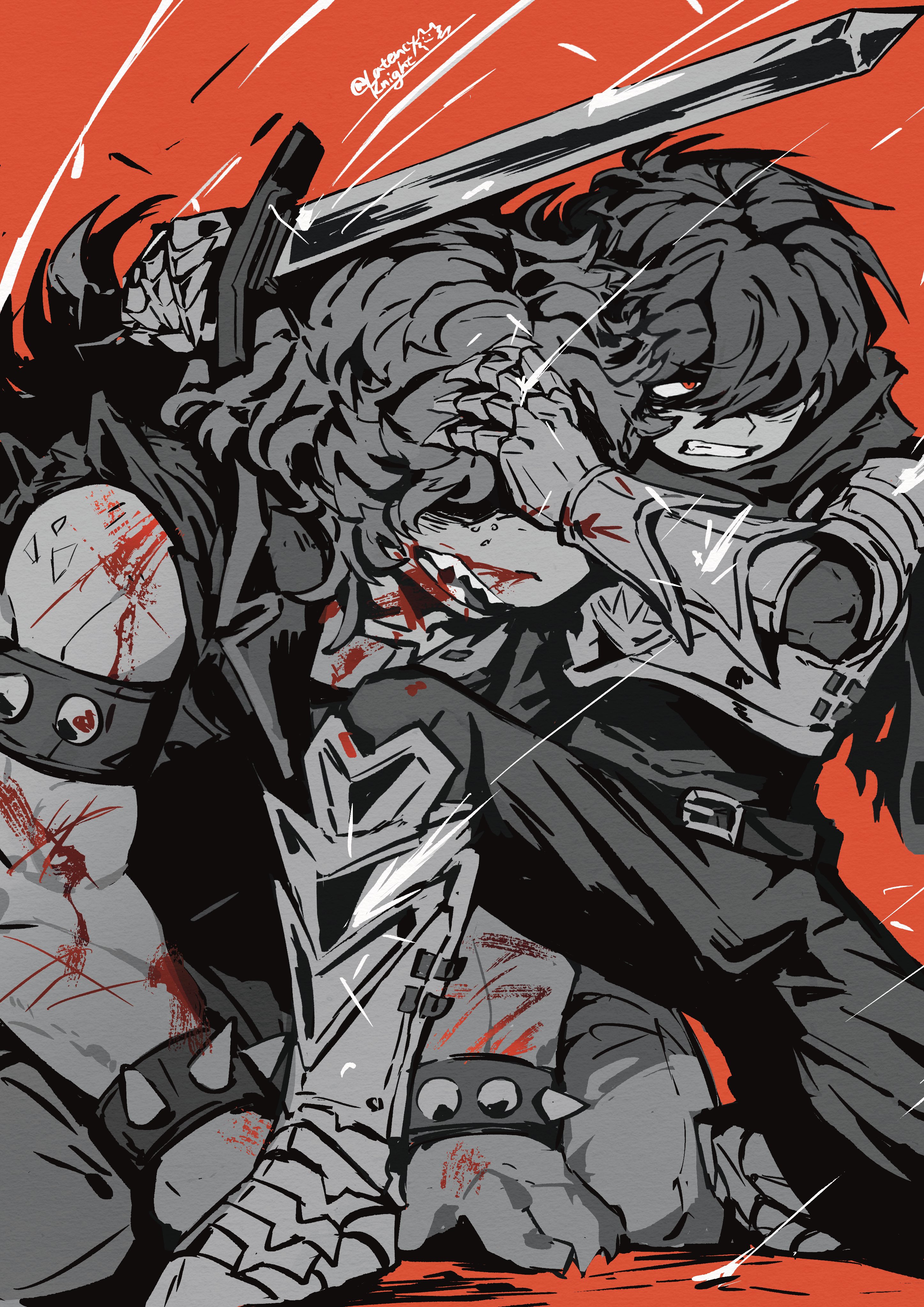 1girl 1other absurdres androgynous armlet armored_boots blood blood_on_face bodysuit boots bracelet clenched_teeth commentary deltarune english_commentary freckles greyscale_with_colored_background highres holding holding_sword holding_weapon jewelry kris_(dark_world)_(deltarune) kris_(deltarune) latencyknight long_hair open_mouth pants red_background red_eyes sharp_teeth short_hair simple_background spiked_armlet spiked_bracelet spikes spot_color susie_(dark_world)_(deltarune) susie_(deltarune) sword teeth utdr_(toby_fox) weapon