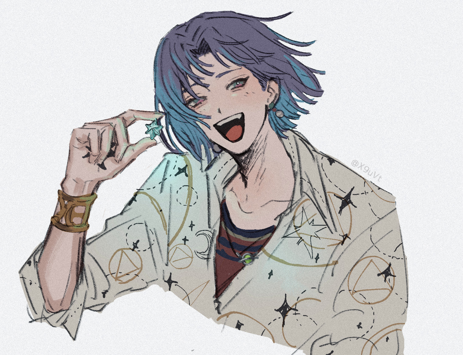 1boy :d blunt_bangs blunt_ends blush bob_cut bracelet choppy_bangs collarbone commentary crescent_print cropped_torso crystal curtained_hair earrings fang film_grain floating_hair glowing glowing_crystal gold_bracelet green_eyes grin hand_up hatching_(texture) holding jewelry layered_shirt linear_hatching looking_at_viewer mahoutsukai_no_yakusoku male_focus murr_hart necklace open_mouth pale_skin parted_bangs partially_unbuttoned print_shirt purple_hair red_shirt shibanuru shirt short_hair sideburns sideways_glance sleeves_rolled_up smile solo sparkle_print striped_clothes striped_shirt twitter_username white_background white_shirt