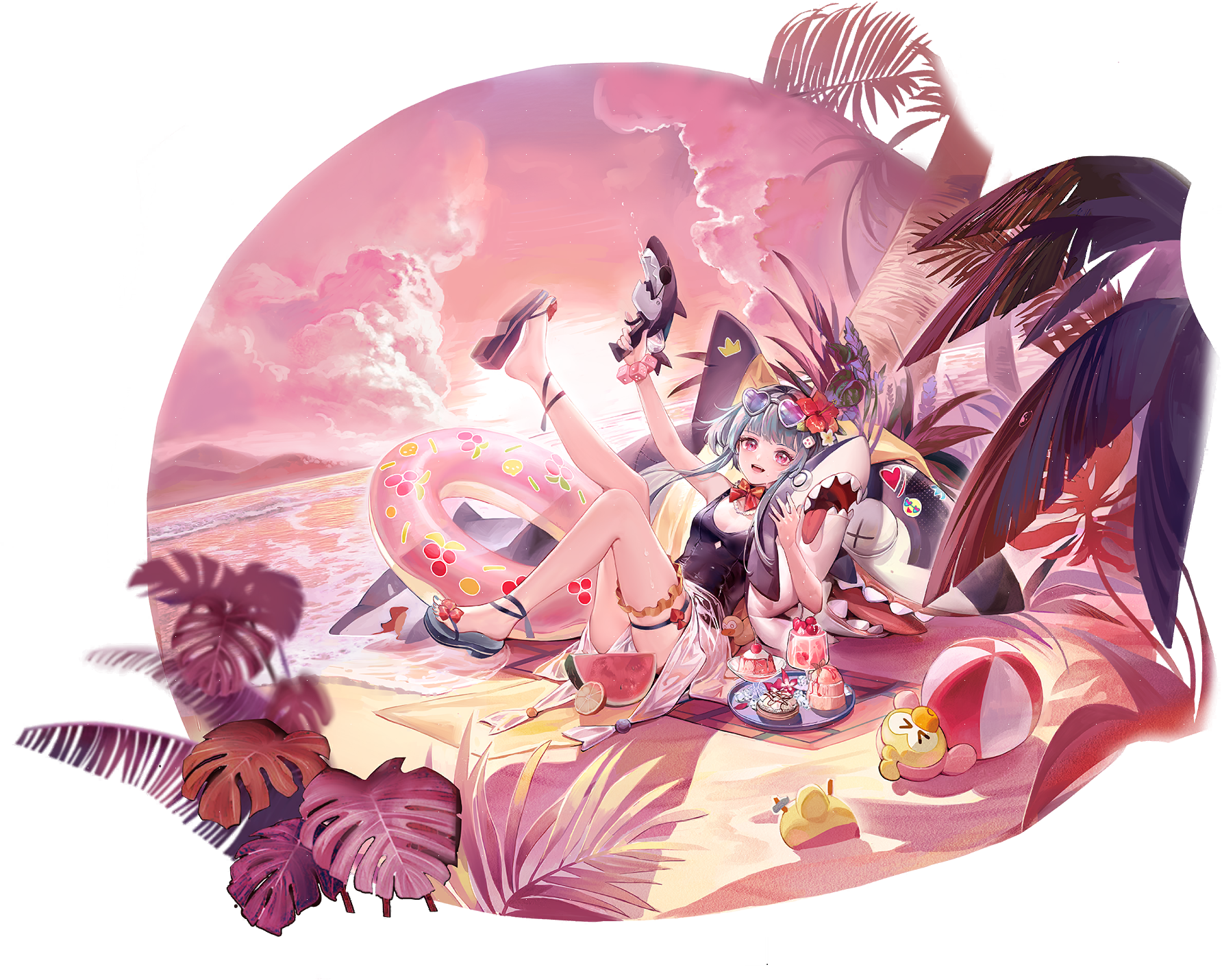 1girl artist_request ball beach beachball bikini blue_hair bow bracelet cherry cleavage_cutout clothing_cutout dice_bracelet dice_hair_ornament drink ducky_(path_to_nowhere) eyewear_on_head flower food fruit hair_flower hair_ornament heart heart-shaped_eyewear highres holding holding_stuffed_toy holding_water_gun inflatable_shark inflatable_toy innertube jewelry official_alternate_costume official_art palm_tree path_to_nowhere red_bow roulecca_(path_to_nowhere) sandals see-through_clothes see-through_skirt skirt stuffed_animal stuffed_shark stuffed_toy sunglasses swim_ring swimsuit symbol-shaped_pupils thigh_strap towel tree water_gun watermelon watermelon_slice x-shaped_pupils