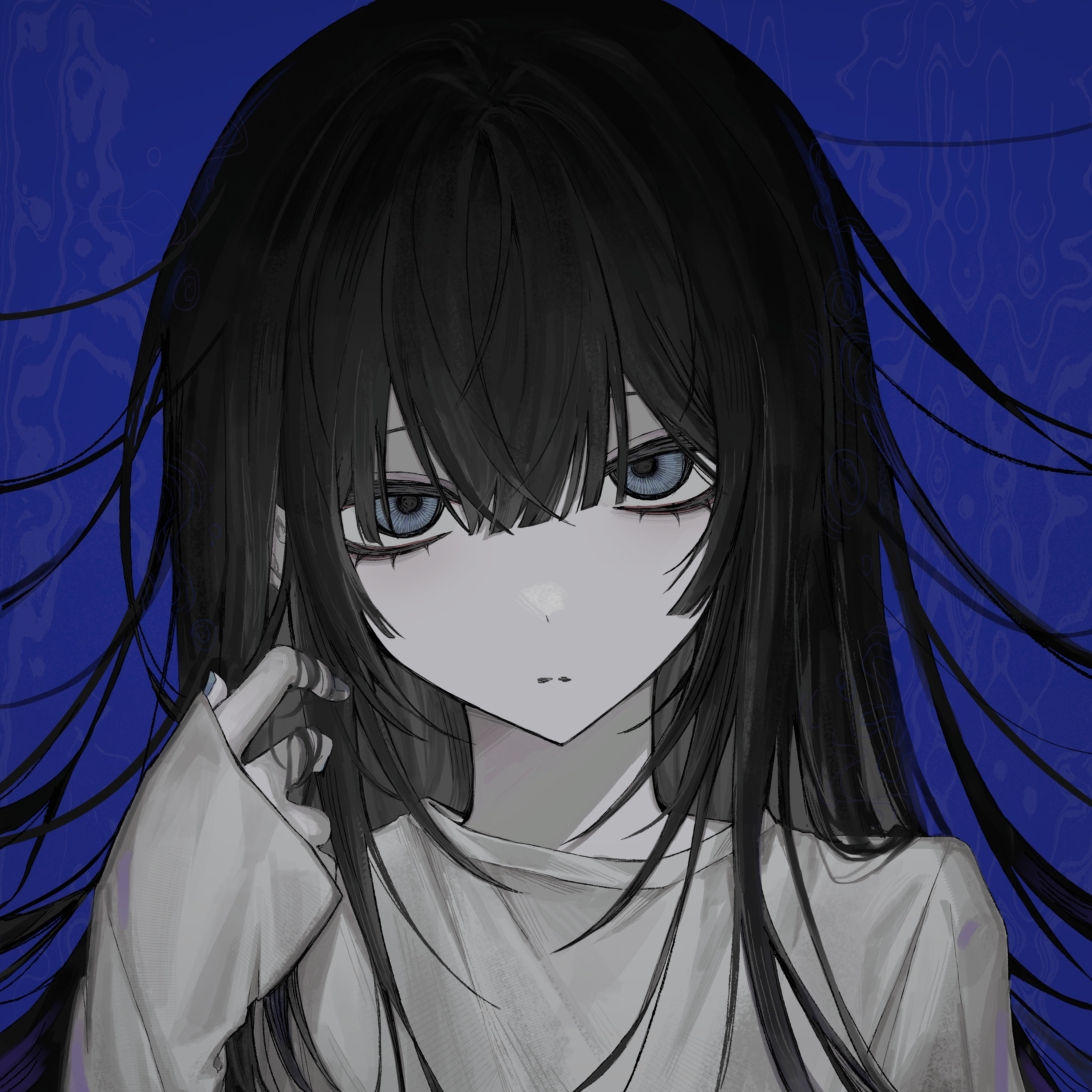 1girl absurdres androgynous black_hair blue_background blue_eyes blue_nails commentary commission english_commentary expressionless hair_between_eyes hand_up highres long_hair long_sleeves looking_at_viewer loose_hair_strand mano0wvw muted_color original pale_skin portrait sleeves_past_wrists solo sweater twirling_hair white_sweater