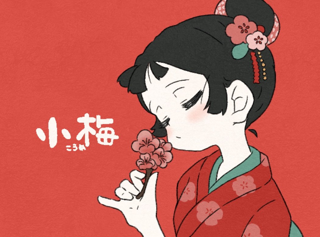 1girl black_hair blush closed_eyes closed_mouth commentary_request floral_print flower hair_bun hair_flower hair_ornament holding holding_flower japanese_clothes kimono koume-chan_(lotte) lotte_(company) red_background red_flower red_kimono sagami_sagari simple_background smile solo upper_body