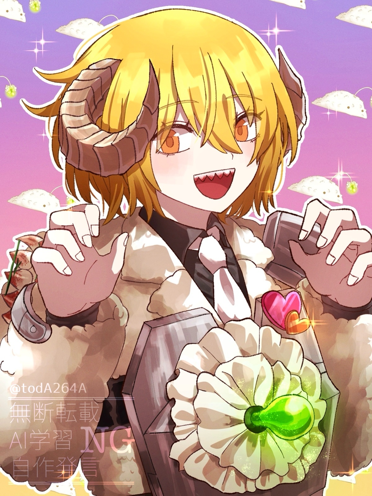 1girl :d arms_up black_shirt blonde_hair commentary_request don_quixote_(project_moon) e.g.o_(project_moon) eyelashes heart highres horns lantern_(e.g.o) lobotomy_corporation lobotomy_corporation_(identity)_(project_moon) looking_at_viewer meat_lantern_(project_moon) necktie open_mouth orange_eyes orange_pupils pink_background project_moon rug_(yurari606) sharp_teeth shirt short_hair smile solo sparkle standing teeth upper_body watermark white_necktie