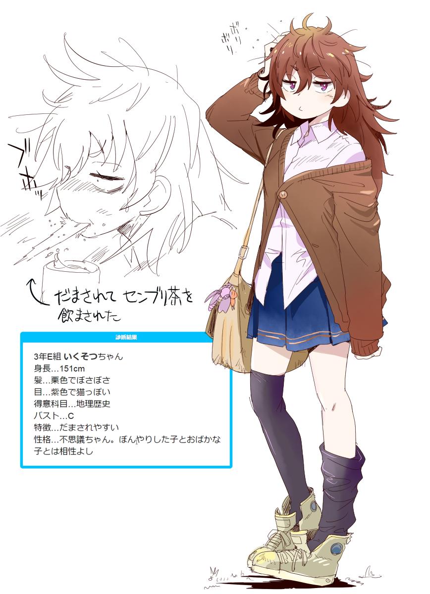 1girl bag black_thighhighs brown_cardigan brown_hair cardigan commentary_request cup full_body hand_on_own_head highres ikusotsu loose_socks messy_hair miniskirt off_shoulder original pleated_skirt purple_eyes shindan_maker shirt shoes skirt sleeves_past_wrists socks spit_take spitting thighhighs translation_request untucked_shirt white_shirt yellow_shoes