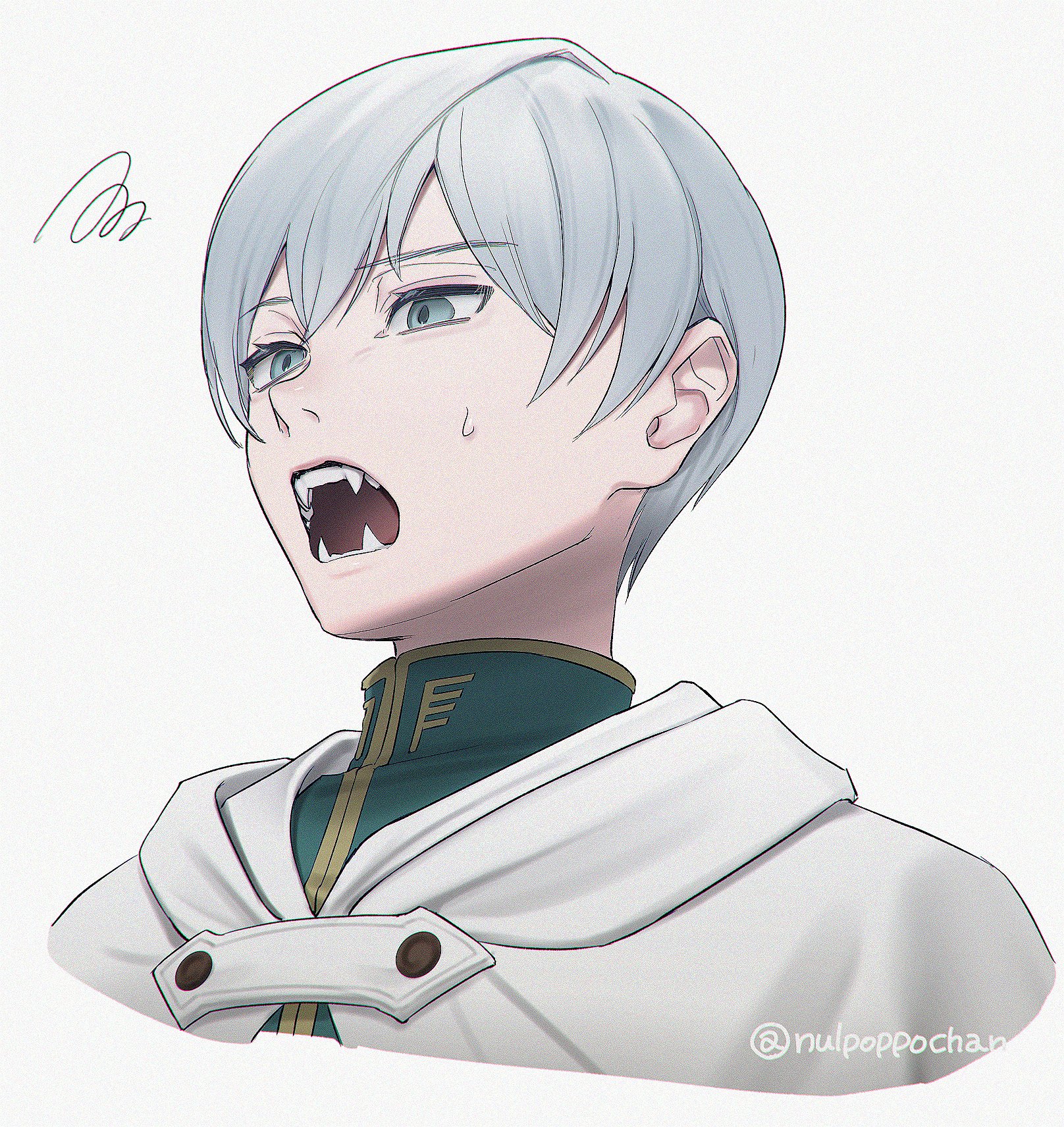 1boy artist_name cape commentary_request double-parted_bangs fangs green_robe grey_eyes grey_hair highres male_focus nulpoppochan octopath_traveler octopath_traveler_ii open_mouth robe short_hair simple_background solo squiggle sweatdrop temenos_mistral twitter_username upper_body white_background white_cape