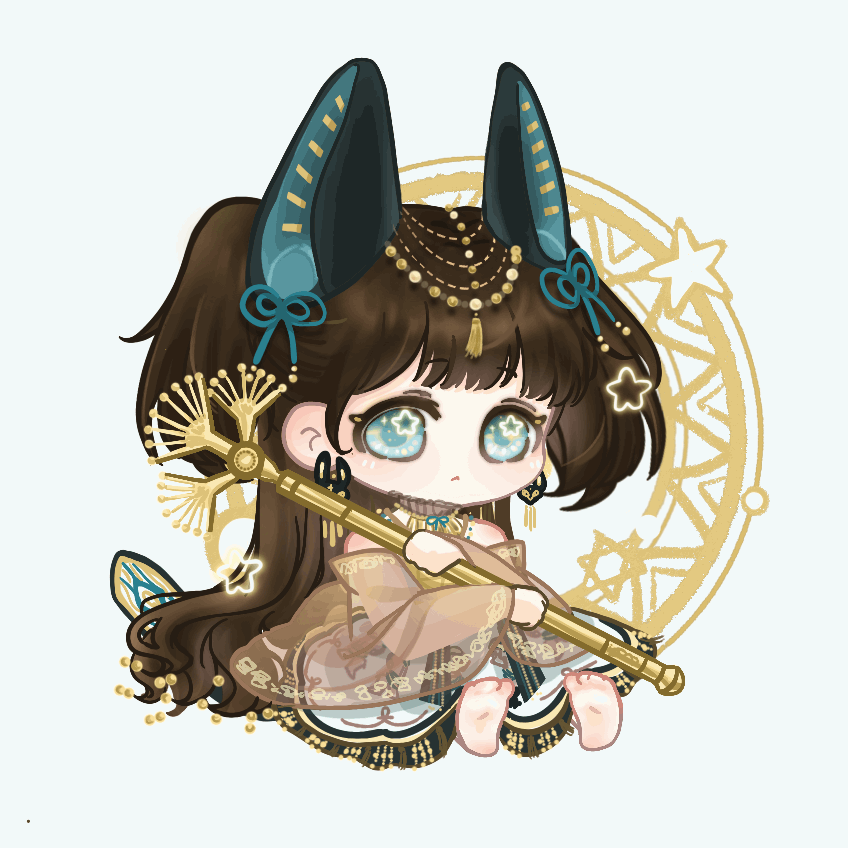1girl animal_ear_fluff animal_ears animated animated_gif bare_shoulders barefoot beads blinking blue_background blue_eyes blue_ribbon brown_collar brown_hair brown_jacket chibi chinese_commentary circle closed_mouth collar commentary_request detached_collar dog_ears dress expressionless eyelashes frilled_collar frilled_dress frills hair_beads hair_ornament hair_ribbon high_collar holding holding_staff jacket light_frown long_dress long_hair long_sleeves looping_animation neck_ribbon nikki_(series) off-shoulder_jacket off_shoulder ribbon see-through_clothes see-through_sleeves shining_nikki sitting soles solo spirit_of_anuwa_(shining_nikki) staff star_(symbol) star_in_eye symbol_in_eye tareme tassel tassel_hair_ornament toes two_side_up very_long_hair wavy_hair white_dress wide_sleeves xiaoyu_qixing