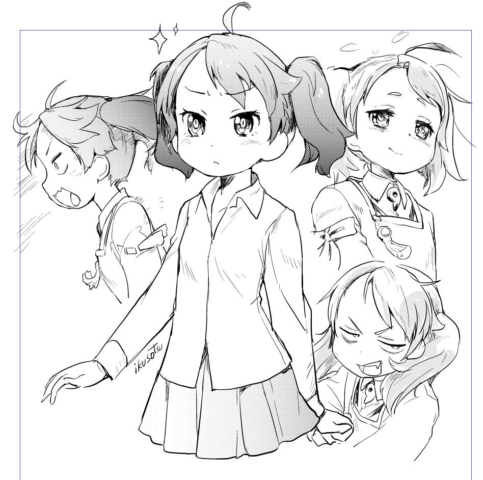 1girl ahoge clenched_hand commentary_request greyscale ikusotsu japanese_clothes kantai_collection kariginu magatama miniskirt monochrome pleated_skirt ribbon-trimmed_sleeves ribbon_trim ryuujou_(kancolle) signature skirt smile sparkle twintails