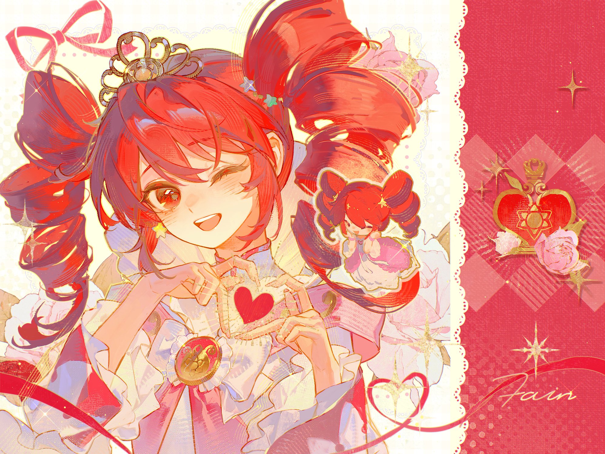 1girl birthday blush crown dress drill_hair earrings english_text engrish_text fine_(futagohime) four-finger_heart_hands frilled_dress frills fushigiboshi_no_futago_hime happy_birthday heart heart_hands highres jewelry juliet_sleeves long_sleeves niukou_kouzi one_eye_closed open_mouth portrait puffy_sleeves ranguage red_eyes red_hair ribbon star_(symbol) star_earrings twin_drills