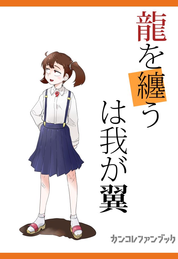 1girl bandaid bandaid_on_leg blue_skirt brown_eyes brown_hair commentary_request cover cover_page full_body hand_on_own_hip ikusotsu kantai_collection looking_to_the_side magatama medium_skirt pleated_skirt ryuujou_(kancolle) sandals shirt skirt sleeves_past_wrists socks solo suspender_skirt suspenders translation_request twintails white_shirt white_socks