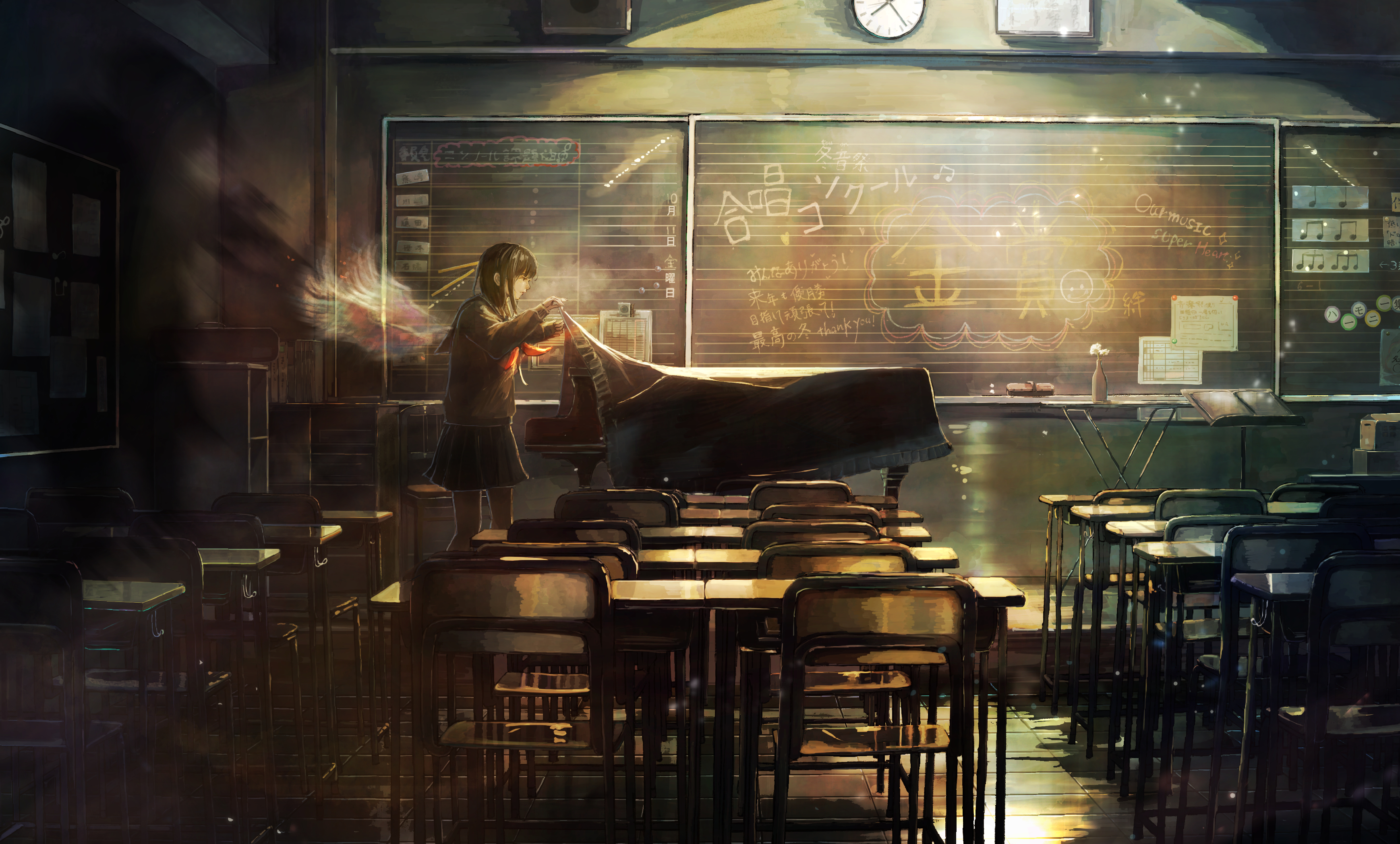 1girl absurdres black_hair black_serafuku black_shirt black_skirt board_eraser bulletin_board cabinet chair chalkboard classroom clock commentary_request desk fake_wings file_cabinet grand_piano highres indoors instrument light_particles long_sleeves medium_hair music_stand neckerchief original piano pleated_skirt profile red_neckerchief sakura_inu_(itoyatomo) scenery school_chair school_desk school_uniform serafuku shirt skirt solo standing stool table vase wall_clock wide_shot wings wooden_floor