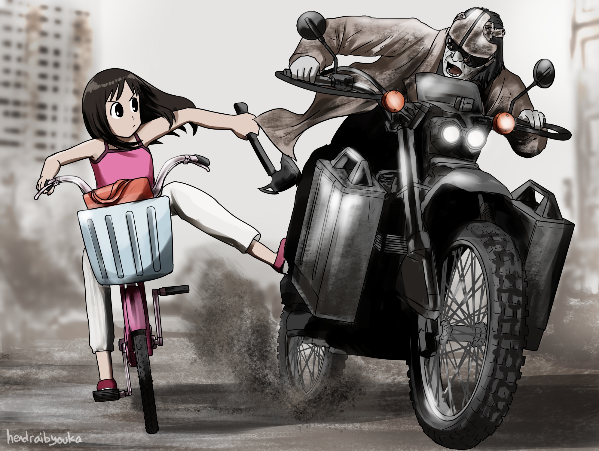 1boy 1girl artist_name axe azumanga_daiou bicycle black_eyes brown_hair building coat commentary crossover dirty dirty_clothes driving english_commentary grey_coat hendraibyouka highres holding holding_axe holding_weapon kasuga_ayumu kicking looking_at_another motor_vehicle motorcycle open_mouth panties parody pink_tank_top resident_evil resident_evil_requiem ruins scene_reference skyscraper tank_top underwear v-shaped_eyebrows victor_gideon weapon white_panties