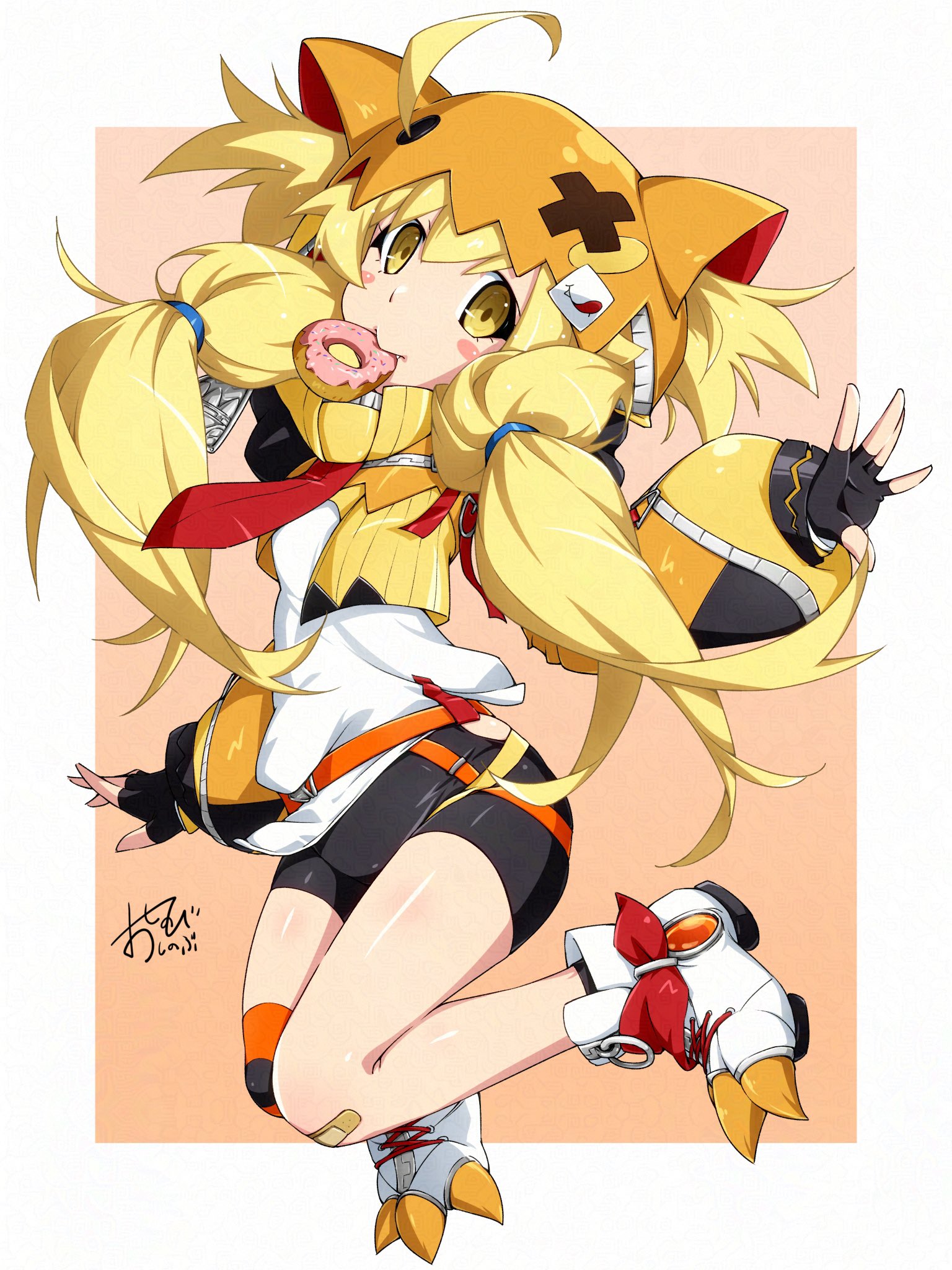 1girl ahoge animal_ear_hood bakemonogatari bandaid bandaid_on_knee bandaid_on_leg bike_shorts black_gloves black_shorts blonde_hair blush_stickers commentary_request commission cosplay donut fake_animal_ears fingerless_gloves food food_in_mouth full_body gigi_murin gigi_murin_(1st_costume) gigi_murin_(cosplay) gloves hair_through_hood highres hololive hololive_english hood hooded_shrug hoodie long_hair long_sleeves looking_at_viewer low-tied_long_hair monogatari_(series) mouth_hold orange_hood orange_hoodie orange_shrug oshino_shinobu oshinobi_shinobu shirt shorts shrug_(clothing) signature skeb_commission solo thighs very_long_hair virtual_youtuber white_shirt