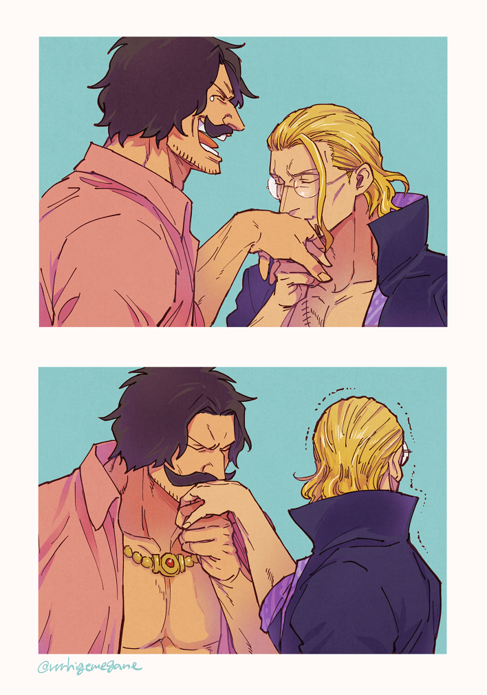 2boys black_hair blonde_hair commentary_request embarrassed facial_hair glasses gol_d._roger handlebar_mustache high_collar kiss kissing_hand multiple_boys mustache one_piece open_mouth pink_shirt rrrhigemegane shirt short_hair silvers_rayleigh sparse_stubble stitched_torso stitches trembling yaoi