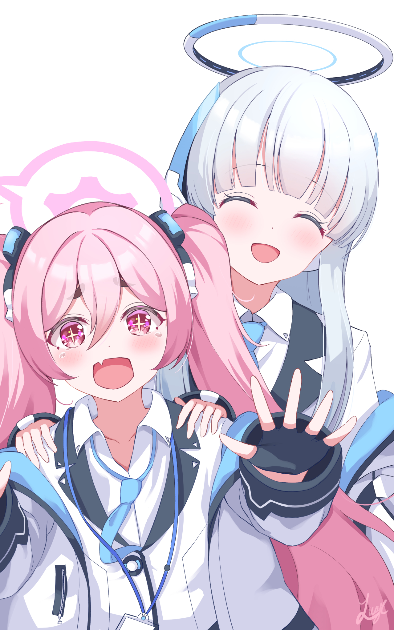 2girls aqua_necktie black_gloves blue_archive blunt_bangs blush braid breasts closed_eyes closed_mouth collarbone collared_shirt commentary_request cross-shaped_pupils fingerless_gloves gloves hair_between_eyes halo headgear highres id_card jacket koyuki_(blue_archive) large_breasts long_hair looking_at_viewer lusye mechanical_halo multiple_girls necktie noa_(blue_archive) pink_hair pink_halo shirt simple_background smile solo symbol-shaped_pupils twintails upper_body very_long_hair white_background white_hair white_jacket white_shirt
