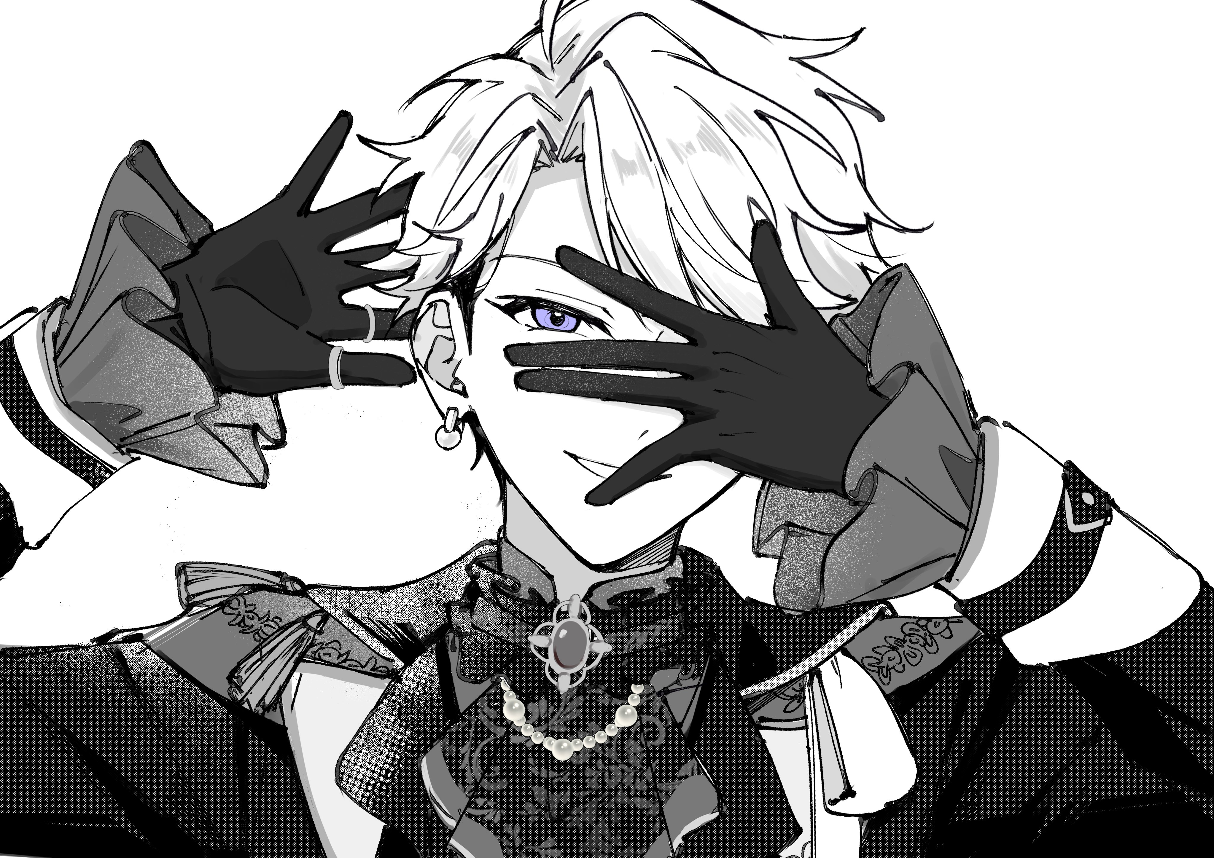 1boy absurdres aibii_(senaru0303) clenched_teeth commentary_request curtained_hair earrings ensemble_stars! frilled_sleeves frills gloves greyscale hands_up highres jewelry long_sleeves looking_at_viewer male_focus monochrome narukami_arashi one_eye_covered open_hands purple_eyes ring short_hair simple_background smile solo teeth upper_body very_short_hair white_background