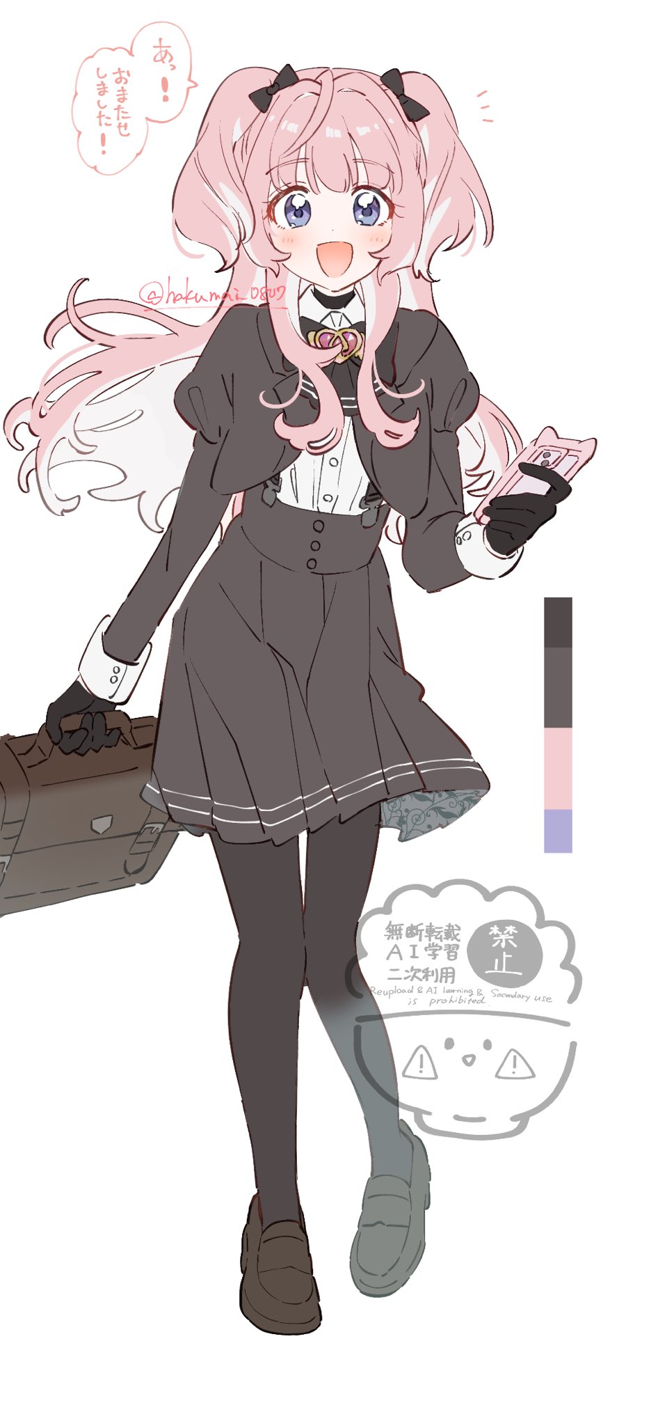 1girl :d black_bow black_gloves black_jacket black_pantyhose black_skirt blue_eyes bow cellphone collared_shirt color_guide colored_inner_hair colored_speech_bubble commentary gloves hair_bow highres holding holding_phone ichigomiya_hane_(raru_buran) iphone jacket juliet_sleeves long_sleeves looking_at_viewer miniskirt multicolored_hair open_mouth original pantyhose phone pink_hair pleated_skirt puffy_sleeves raru_buran school_uniform shirt skirt smartphone smartphone_case smile solo speech_bubble streaked_hair watermark white_hair white_shirt white_streaks