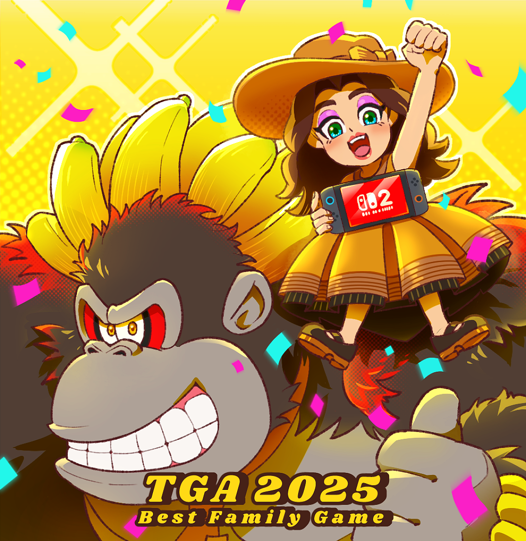 1boy 1girl arm_up banana black_shoes celebration commentary_request confetti donkey_kong donkey_kong_(series) donkey_kong_bananza dress eyeshadow food fruit furry furry_male green_eyes grin hat makeup mario_(series) nintendo nintendo_switch_2 open_mouth pauline_(nintendo) pauline_(young)_(nintendo) pink_eyeshadow sarunosuke_gm shoes smile the_game_awards yellow_background yellow_dress yellow_eyes yellow_hat