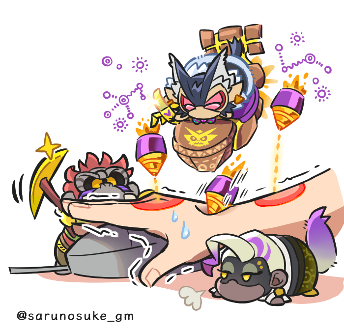 closed_eyes commentary_request computer_mouse donkey_kong_(series) donkey_kong_bananza drill grumpy_kong holding holding_computer_mouse multicolored_hair nintendo pickaxe poppy_kong purple_streaks sarunosuke_gm simple_background size_difference streaked_hair twitter_username void_kong white_background white_hair yellow_eyes
