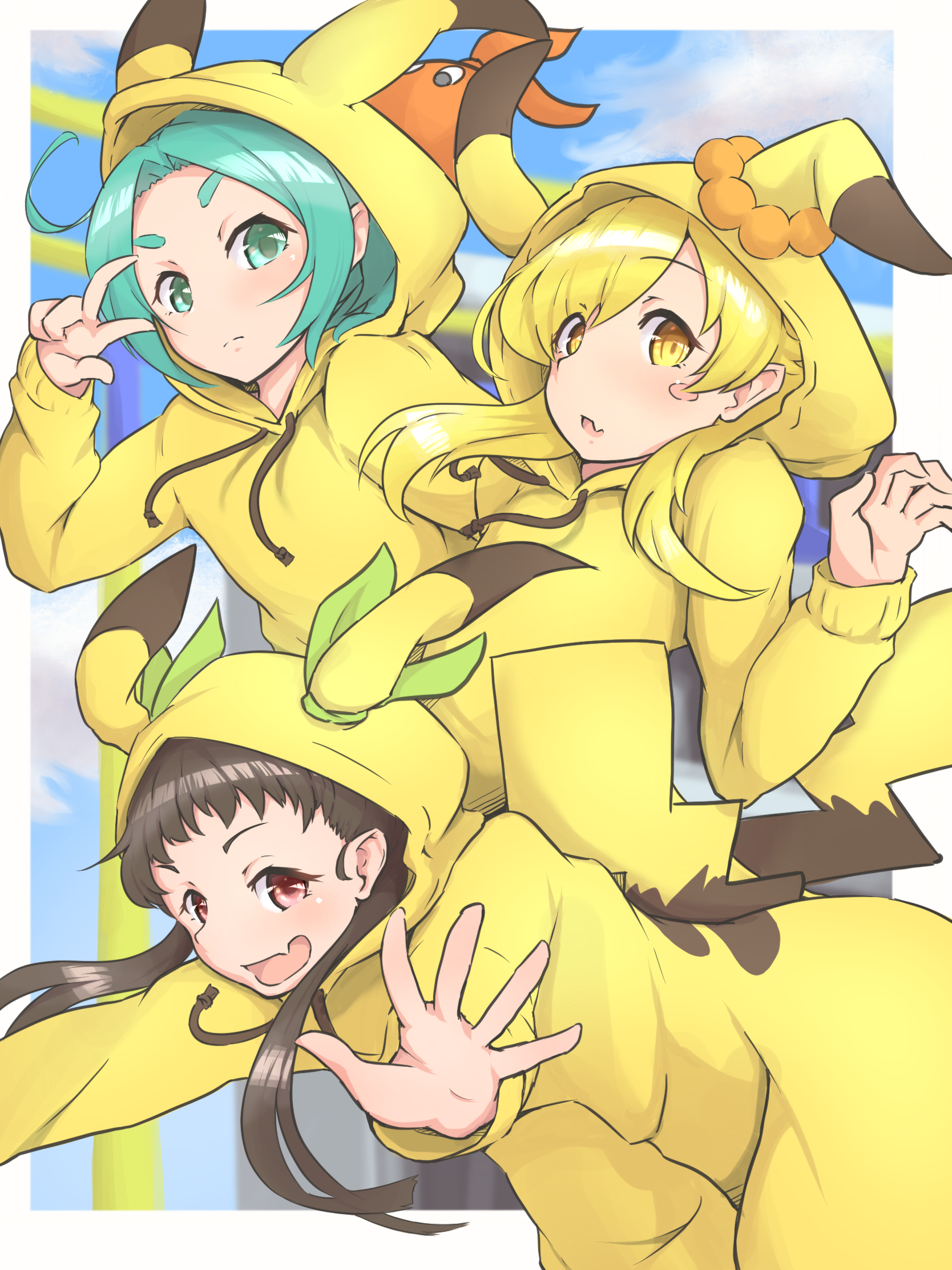 3girls animal_ears aqua_hair black_hair blonde_hair blue_sky bunoshii cloud commentary_request cosplay fang gen_1_pokemon googly_eyes green_eyes hachikuji_mayoi highres hood kigurumi long_hair long_sleeves looking_at_viewer monogatari_(series) multiple_girls nintendo ononoki_yotsugi open_mouth oshino_shinobu pikachu pikachu_costume pikachu_ears pikachu_tail pointy_ears pokemon pokemon_tail red_eyes skin_fang sky tail v vampire yellow_eyes