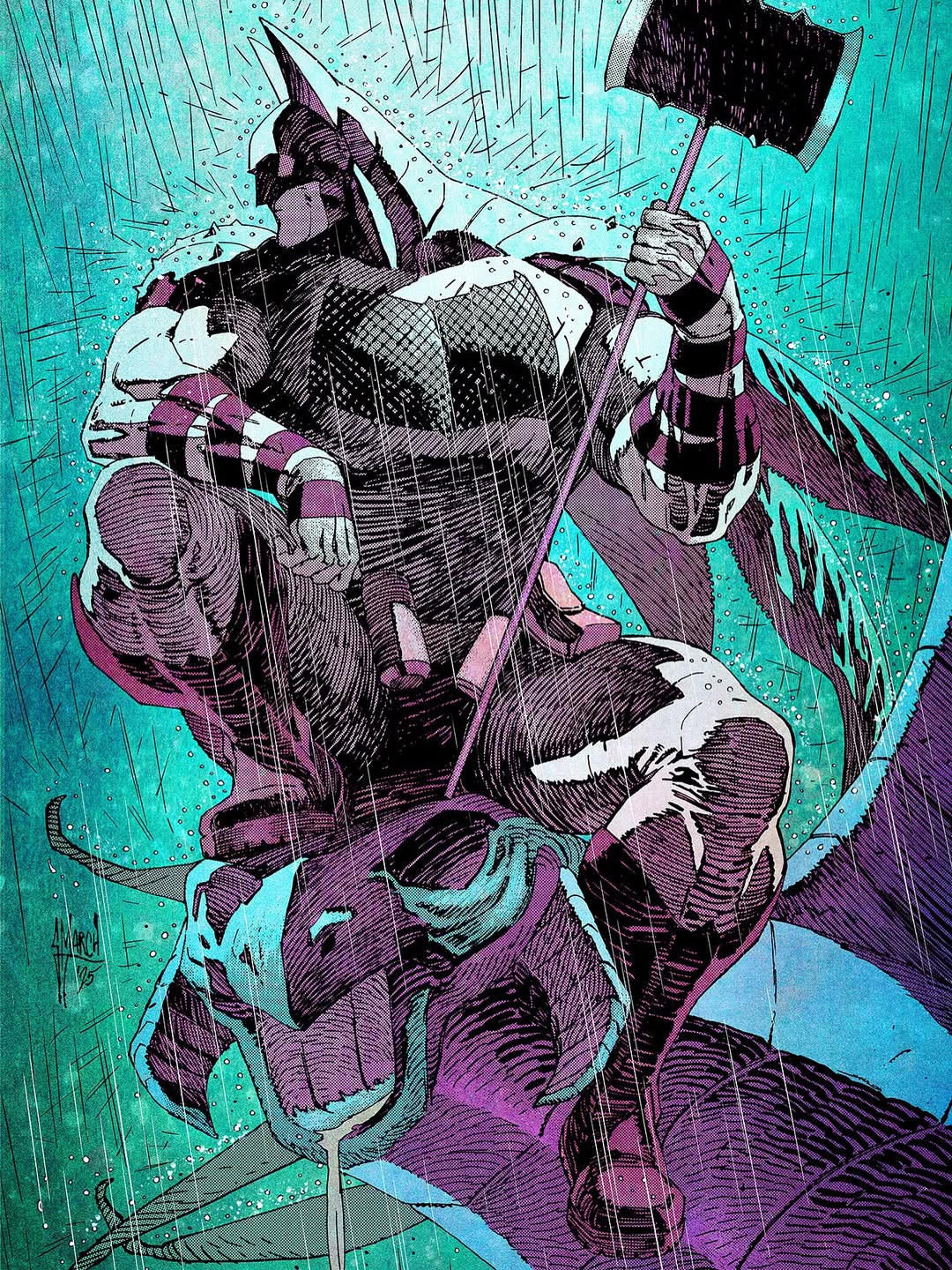 1boy absolute_batman absolute_dc axe back_spikes bat_mask batman batman_(absolute_dc) batman_(series) batman_symbol battle_axe belt black_cape bodysuit cape cowl dc_comics grey_bodysuit guillem_march highres male_focus solo superhero_costume taut_bodysuit utility_belt weapon