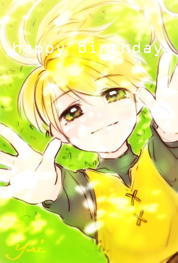 1girl absurdres ahoge artist_request blonde_hair day english_text female_focus flat_chest from_above grass happy happy_birthday high_ponytail highres light_particles long_hair long_sleeves looking_at_viewer lying matching_hair/eyes nintendo on_back on_ground open_hands outdoors outstretched_arms petite pokemon pokemon_adventures ponytail reaching reaching_towards_viewer shirt shirt_under_vest sunlight swept_bangs turtleneck turtleneck_shirt upper_body vest yellow_(pokemon) yellow_eyes yellow_vest