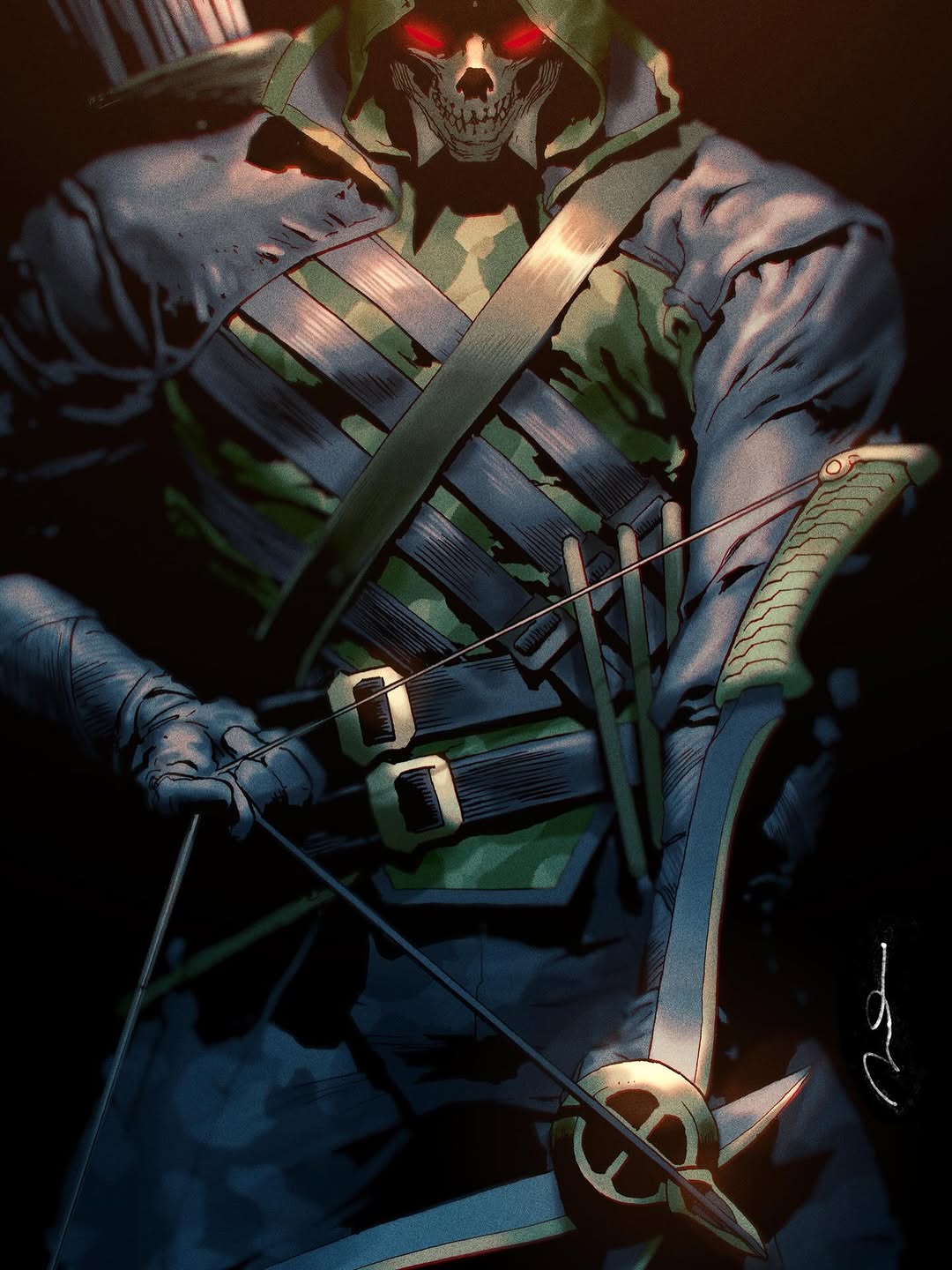 1boy absolute_dc archery arrow_(projectile) bow_(weapon) comic_cover dc_comics gerald_parel green_arrow green_arrow_(series) green_hood green_mask highres holding holding_arrow holding_bow_(weapon) holding_weapon male_focus mask solo weapon