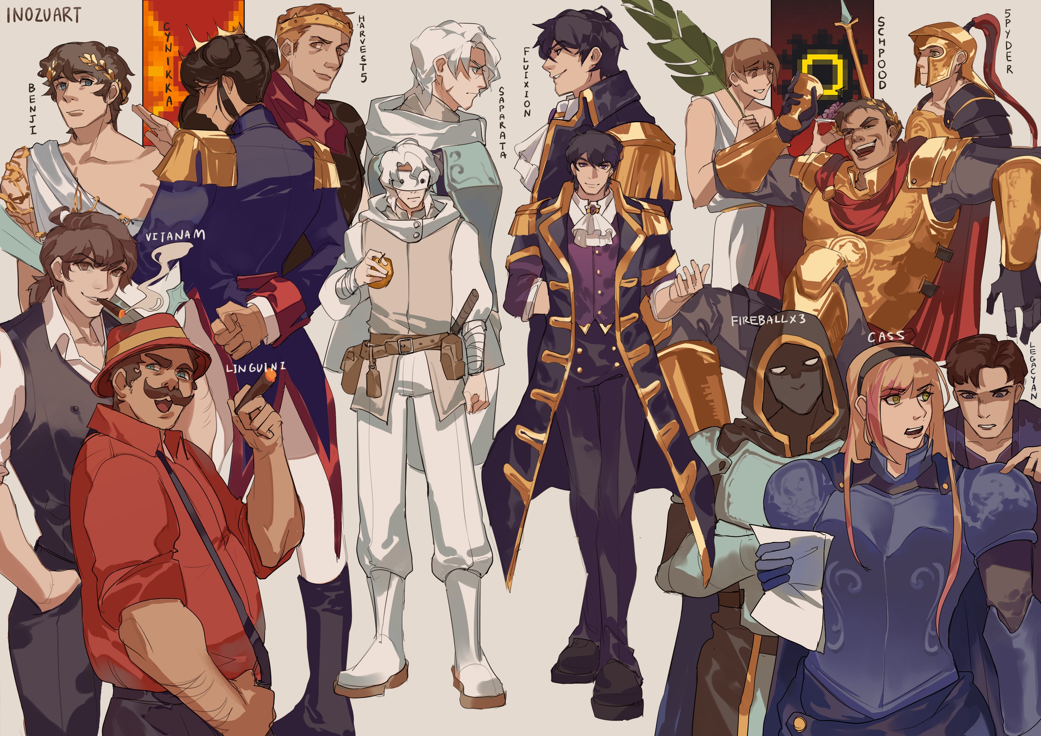 2girls 6+boys absurdres armor ascot belt black_coat black_hair black_pants black_shoes boots breastplate brown_hair character_name cigar coat collared_shirt commentary cup cynikka english_commentary epaulettes facial_hair fluixon gloves gold_armor gold_trim greco-roman_clothes hat head_wreath helmet highres holding holding_cup hood hooded_jacket inozuart ish's_state_smp jacket long_hair minecraft_youtube multiple_boys multiple_girls mustache open_clothes open_coat open_mouth orange_hair pants pauldrons red_hat red_shirt saparata shirt shoes short_hair shoulder_armor toga vambraces white_ascot white_boots white_hair white_jacket white_pants white_shirt