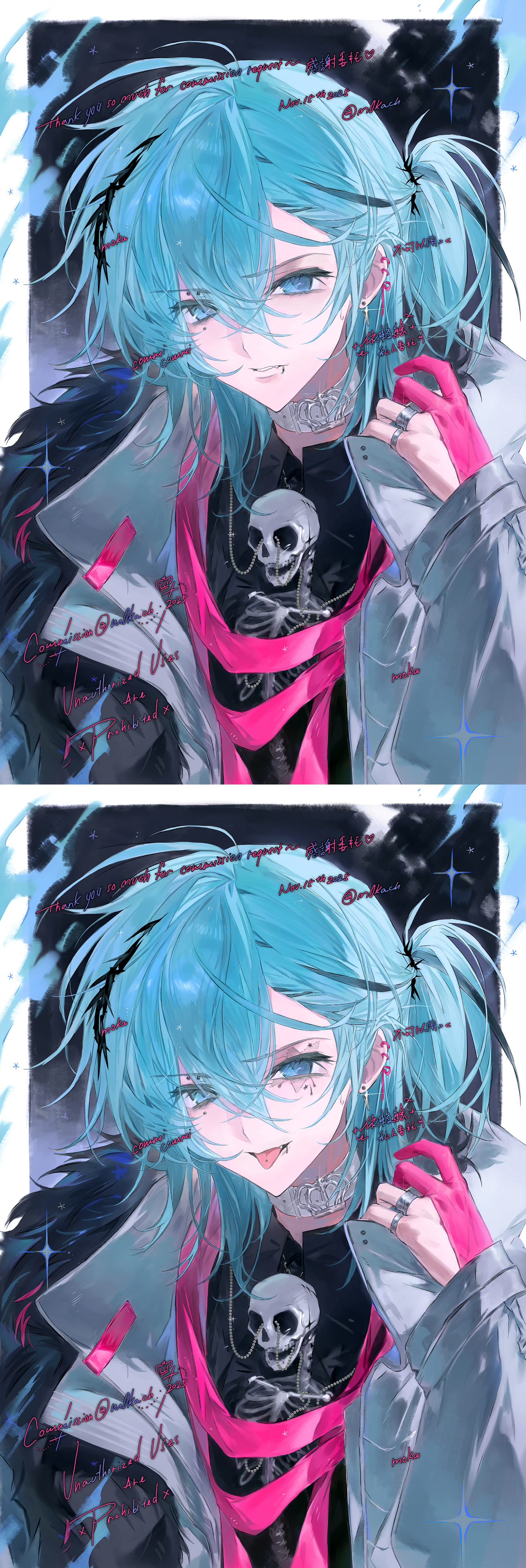 1boy absurdres aqua_hair black_shirt blue_eyes blue_hair choker coat collared_shirt cross ear_piercing earrings fur_trim gloves hair_between_eyes highres inverted_eyelashes jacket jewelry long_sleeves looking_at_viewer m0kach male_focus multiple_rings multiple_views open_mouth original pale_skin piercing pink_gloves ring shirt skull smile solo tongue tongue_out twintails upper_body