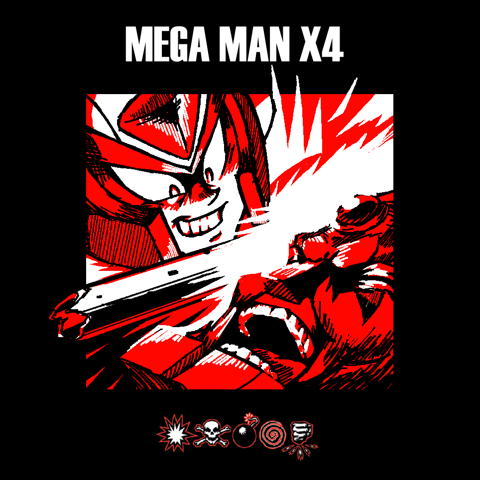1boy 1girl album_cover album_cover_redraw copyright_name cover derivative_work grin helmet kmfdm mega_man_(series) mega_man_x4 mega_man_x_(series) monochrome open_mouth parody red_theme serpentzero sigma_(mega_man) slapping smile symbols_(kmfdm) teeth title zero_(mega_man)