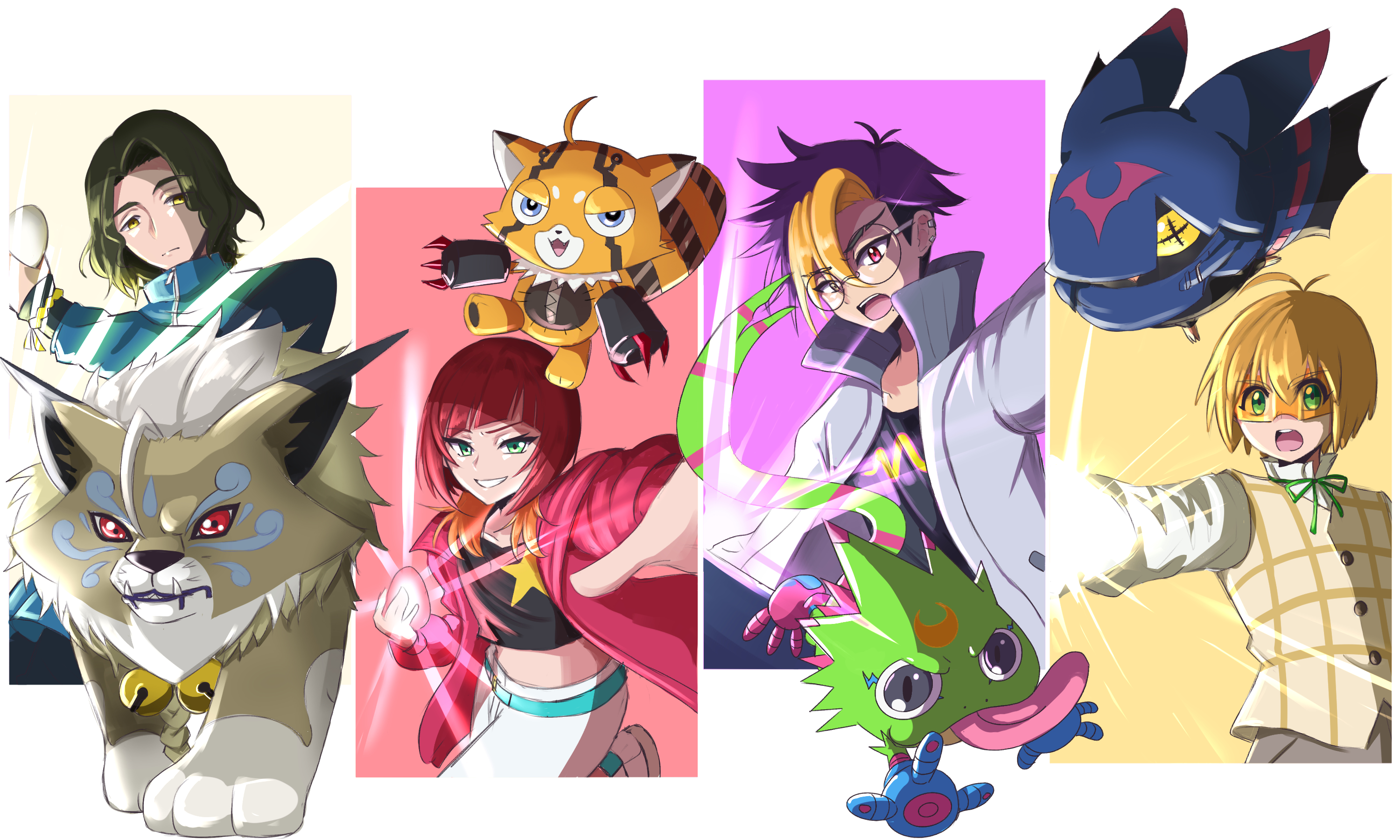 black_fur chiropmon claws cougarmon digimon digimon_(creature) digimon_beatbreak diginoa gekkomon jacket kuonji_makoto multicolored_fur orange_fur pristimon sakuya_reina sawashiro_kyo short_hair star_(symbol) tail tenma_tomoro white_fur
