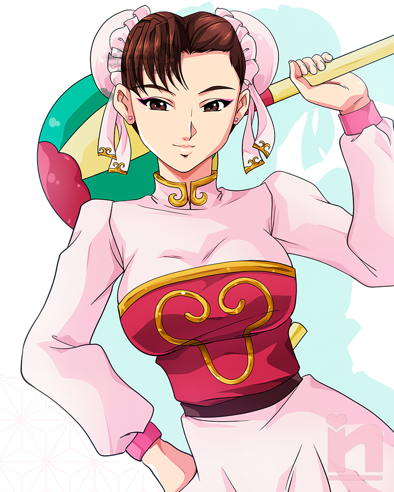 1girl brown_eyes brown_hair bun_cover capcom chinese_clothes chui_(weapon) chun-li cosplay cropped hand_on_own_hip holding holding_weapon looking_at_viewer ranma_1/2 saotome_nanda shampoo_(ranma_1/2) shampoo_(ranma_1/2)_(cosplay) signature smile street_fighter weapon