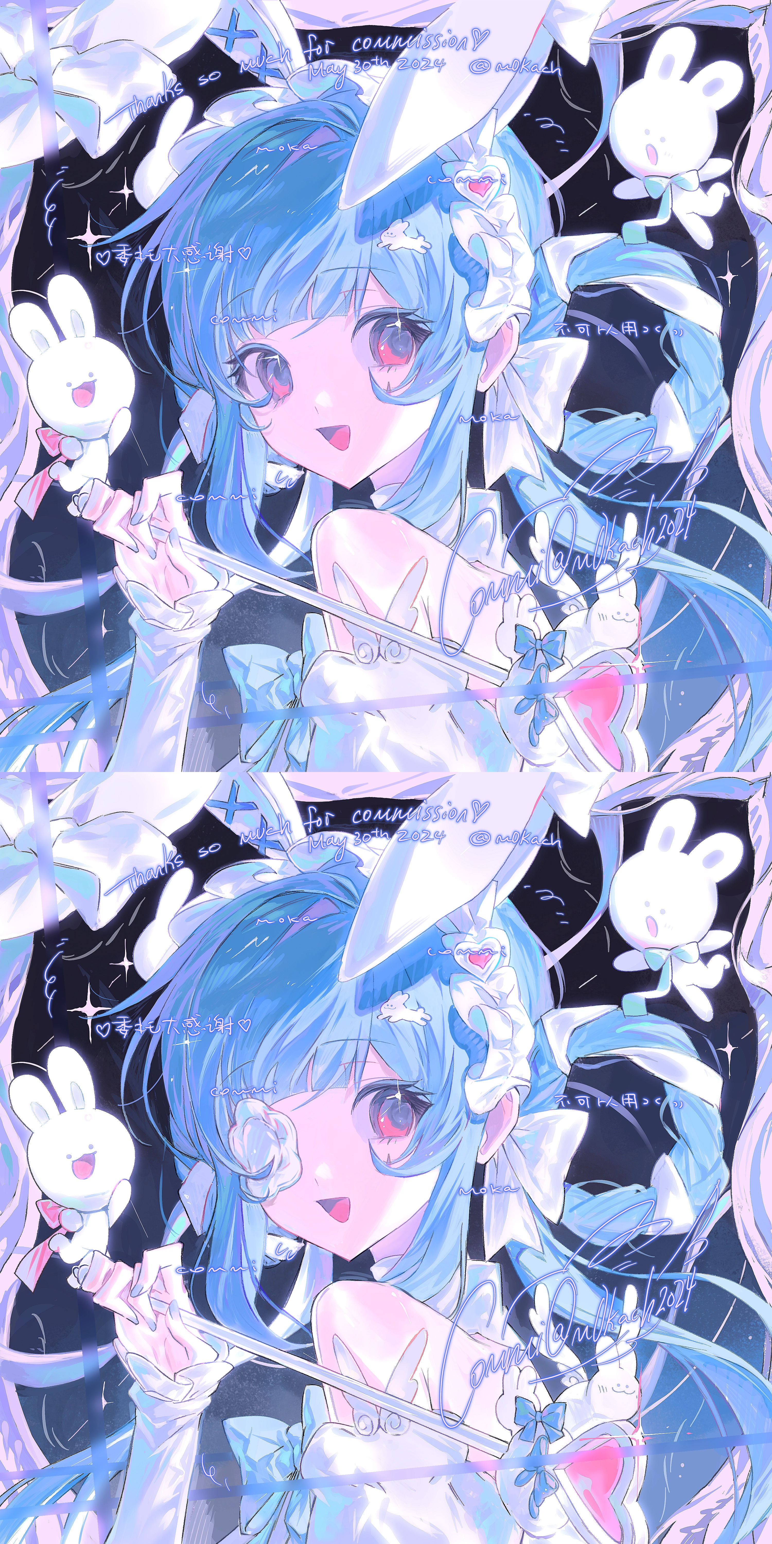 1girl 2024 absurdres animal_ears bare_shoulders blue_bow blue_hair bow braid commission dated detached_sleeves dress english_text eyepatch fake_animal_ears flower hair_bow hair_ornament heart heart_hair_ornament highres holding holding_wand long_hair long_sleeves looking_at_viewer m0kach open_mouth original pale_skin pink_eyes puffy_sleeves rabbit rabbit_ears sidelocks smile solo tareme upper_body wand watermark white_bow white_dress white_flower white_sleeves