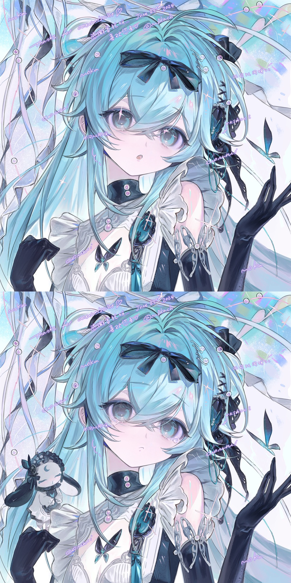 1girl 2024 black_bow black_gloves black_ribbon blue_eyes blue_hair bow commission crossed_bangs dated dress elbow_gloves frills gloves hair_between_eyes hair_bow hair_ornament hair_ribbon hands_up head_tilt highres holding inverted_eyelashes long_hair looking_at_viewer m0kach multiple_views open_mouth original pale_skin parted_lips ribbon sleeveless sleeveless_dress tareme upper_body