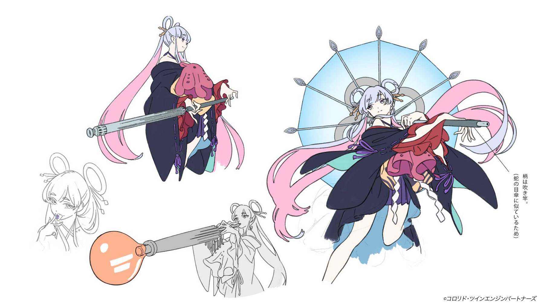 1girl bare_shoulders cho_kaguya-hime! collarbone_piercing concept_art copyright_notice glass_blowing hair_ornament hair_rings hair_stick highres hiro_(gokinjyo) holding holding_umbrella japanese_clothes leg_up long_hair multicolored_hair pink_hair purple_skirt runami_yachiyo skirt solo tongue tongue_out translation_request twintails two-tone_hair umbrella umbrella_octopus very_long_hair white_hair