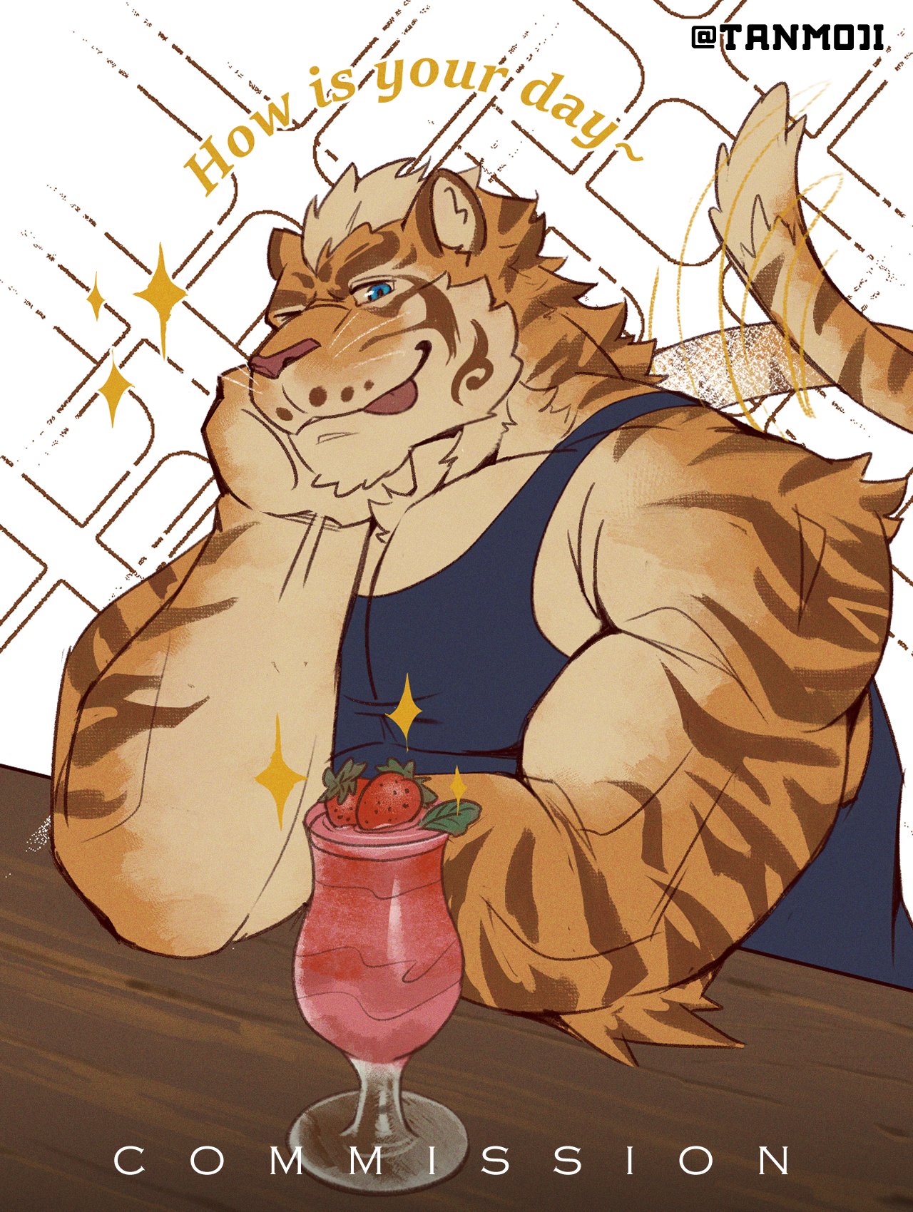 1boy animal_ears artist_name bara biceps black_tank_top commentary english_commentary english_text furry furry_male head_on_hand highres lin_hu_(nekojishi) looking_at_viewer male_focus muscular muscular_male nekojishi orange_fur pectoral_cleavage pectorals smile tail tail_wagging tank_top tanmoji_x tiger_boy tiger_ears tiger_stripes tiger_tail tongue tongue_out twitter_username whiskers