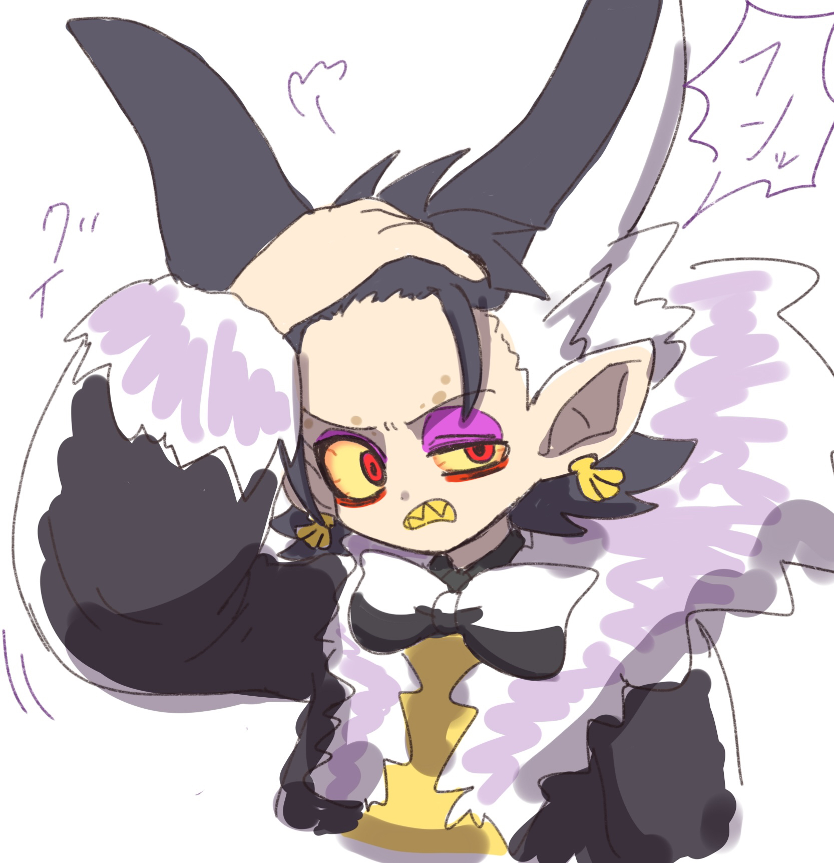 1boy bow bowtie coat colored_sclera commentary_request donkey_kong_(series) donkey_kong_bananza fur-trimmed_coat fur_trim hair_ears half-closed_eye hand_on_own_head highres humanization liver_spots looking_at_viewer male_focus negichans_21 nintendo red_eyes sharp_teeth shirt teeth translation_request void_kong yellow_sclera yellow_shirt