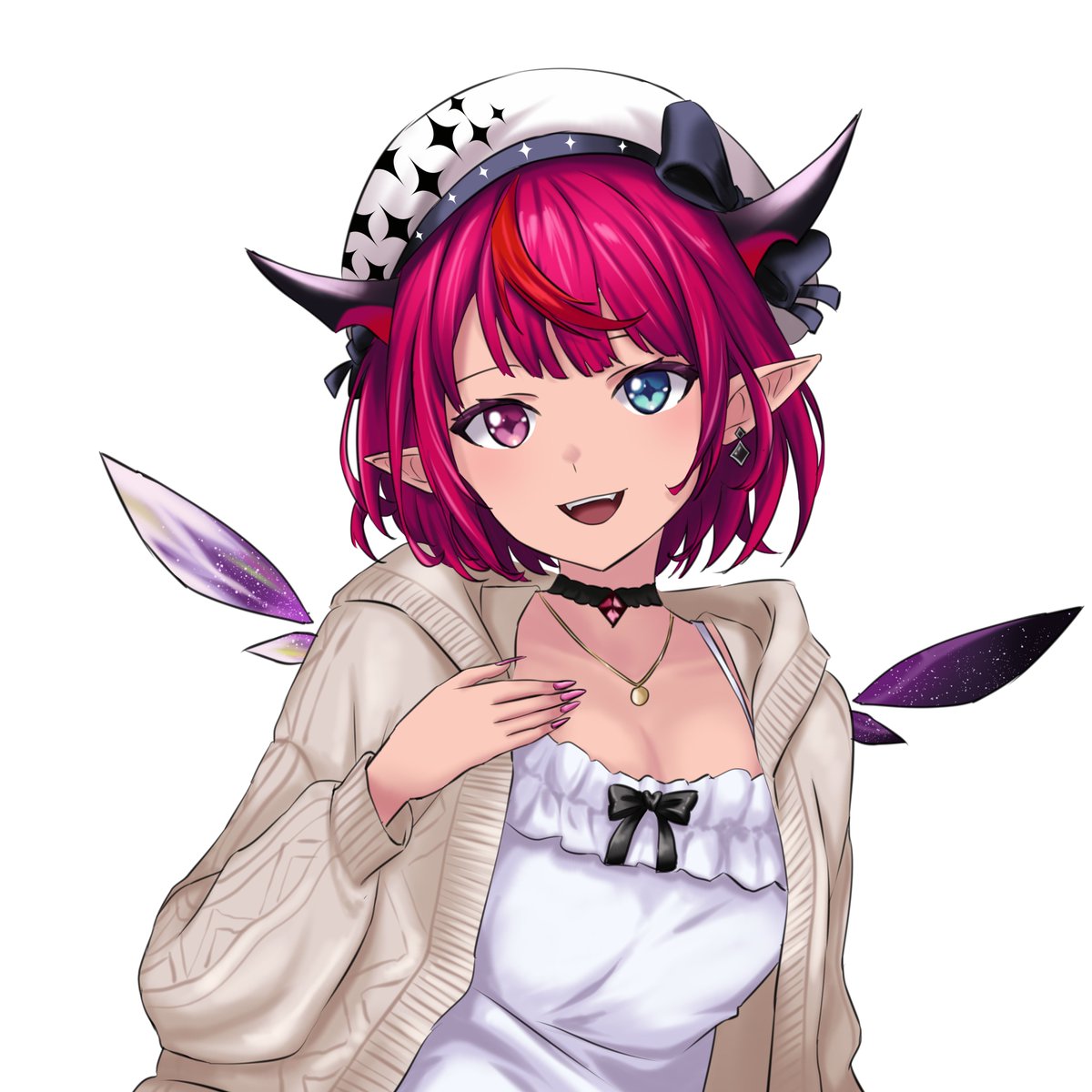 1girl black_choker blue_eyes breasts choker dress earrings heterochromia highres hololive hololive_english horns irys_(casualrys)_(hololive) irys_(hololive) jewelry official_alternate_costume pointy_ears red_hair shirohodo short_hair smile solo virtual_youtuber white_dress