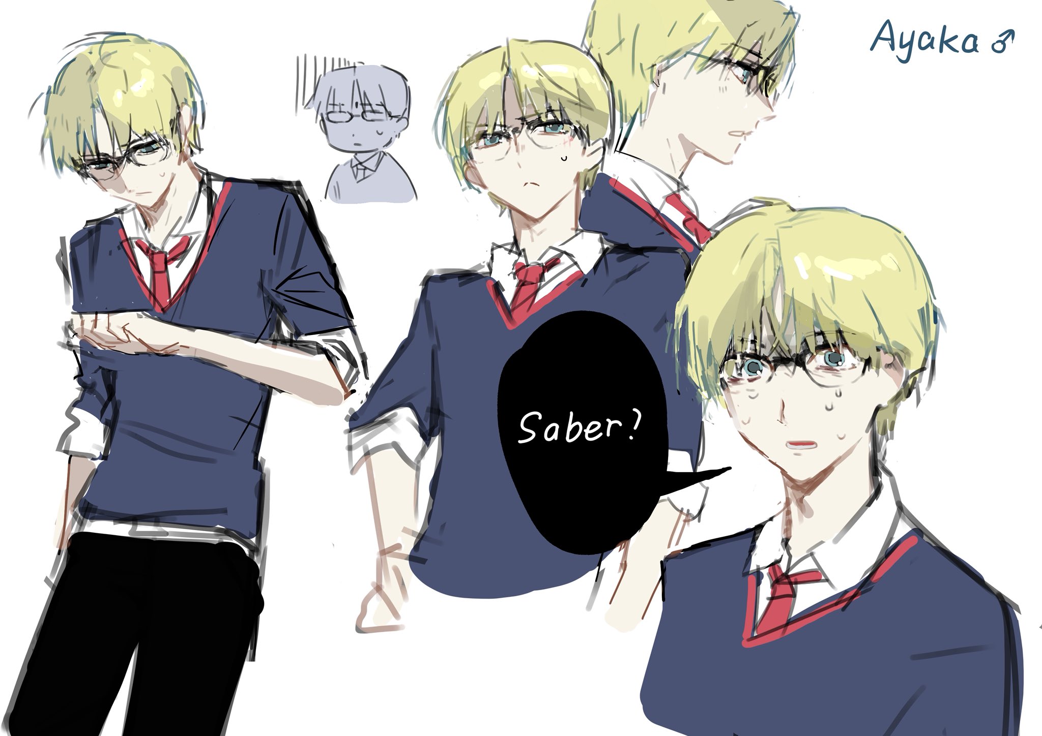 1boy blonde_hair blue_eyes braid chabudelibai collared_shirt commentary_request english_text fate/strange_fake fate_(series) genderswap genderswap_(ftm) glasses highres male_focus multiple_views necktie pants sajou_ayaka_(fate/strange_fake) shirt short_hair side_braid simple_background solo_focus speech_bubble sweatdrop sweater white_background