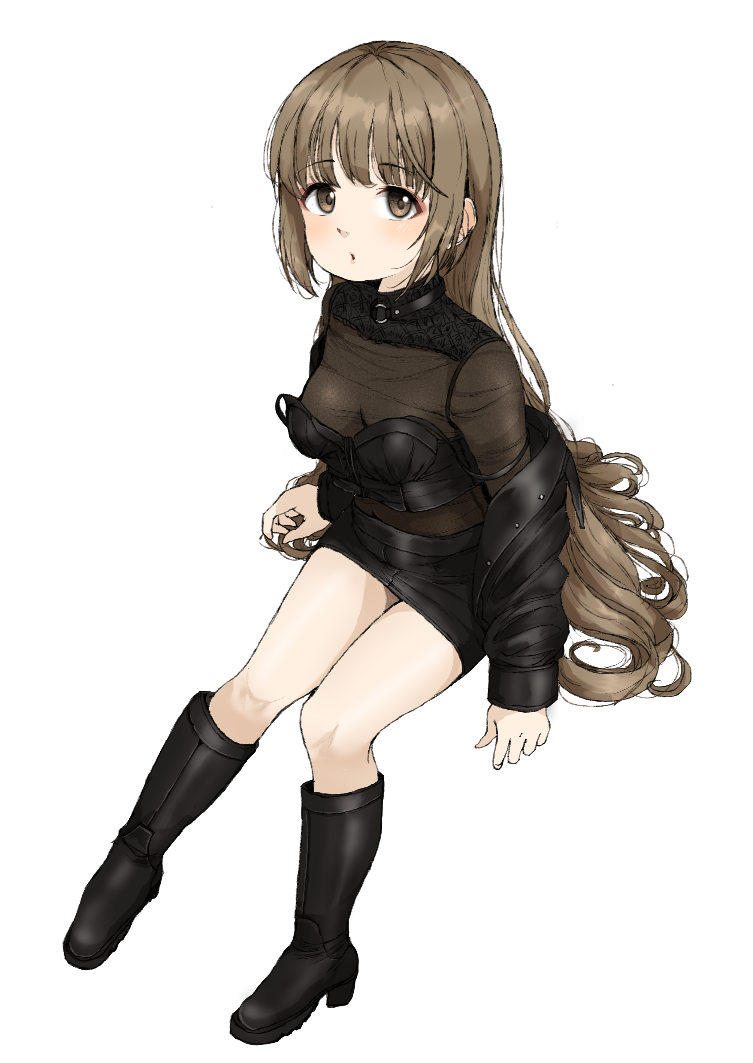 1girl absurdres black_jacket blush boots breasts brown_eyes brown_hair commentary eyeliner full_body gatsby_ssl high_heel_boots high_heels highres idolmaster idolmaster_cinderella_girls jacket long_hair looking_at_viewer makeup miniskirt off_shoulder open_clothes open_jacket parted_lips see-through_clothes sitting skirt small_breasts solo very_long_hair yorita_yoshino