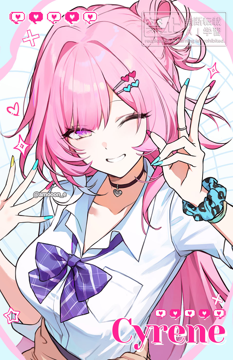 1girl aamoooon_e alternate_costume black_choker bow bowtie breasts character_name choker clenched_teeth commentary cyrene_(honkai:_star_rail) heart heart_choker heart_hairclip highres honkai:_star_rail honkai_(series) jewelry long_hair looking_at_viewer medium_breasts multicolored_nails one_eye_closed pink_hair purple_bow purple_bowtie purple_eyes ring scrunchie shirt solo teeth untranslatable_commentary upper_body white_shirt wrist_scrunchie