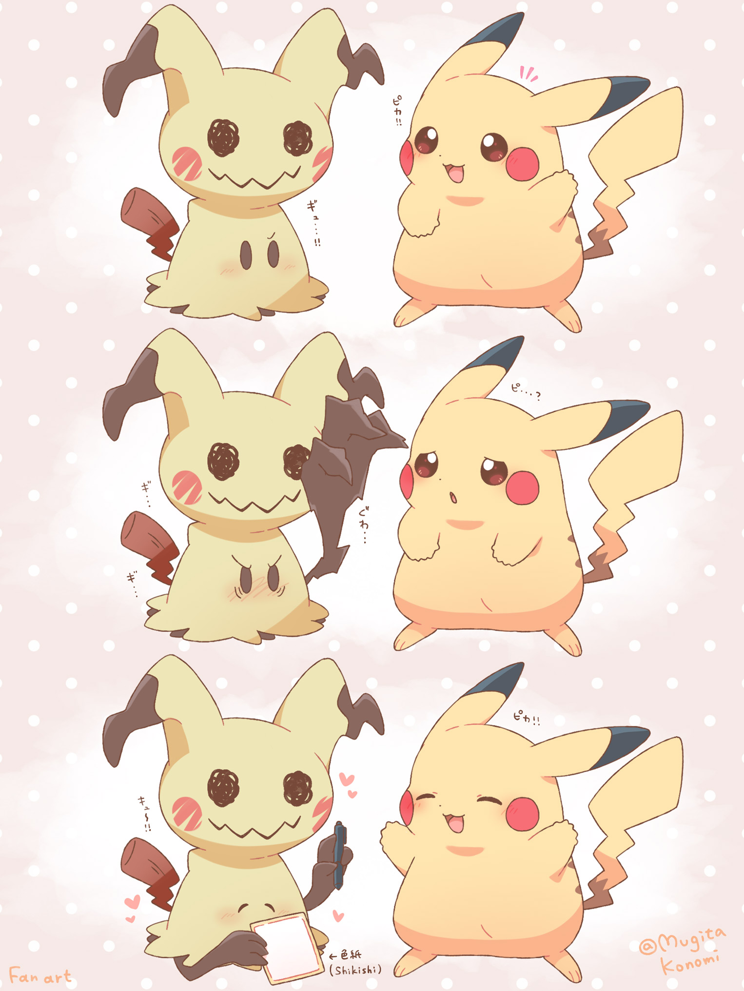 blush closed_eyes commentary_request drawn_eyes gen_1_pokemon gen_7_pokemon highres holding holding_paper holding_pen mimikyu mugita_konomi nintendo no_humans open_mouth paper pen pikachu pokemon pokemon_(creature) pokemon_focus smile solid_oval_eyes tail