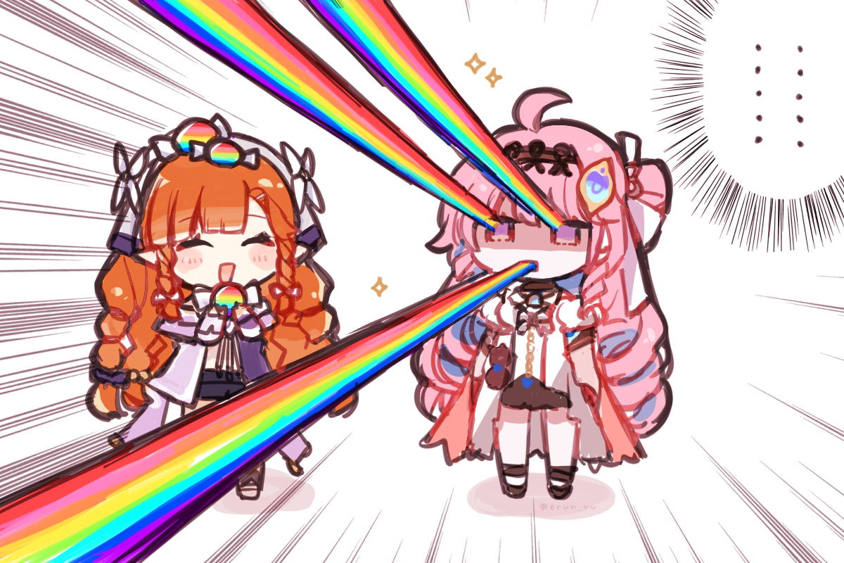 ... 2girls ahoge braid braided_sidelocks candy chibi chibi_only closed_eyes commentary_request denia_(wuthering_waves) dress erun_ru food hair_ornament holding jacket long_hair multiple_girls open_mouth orange_hair pink_hair pointy_ears purple_eyes rainbow shaded_face sidelocks sigrika_(wuthering_waves) smile white_dress wuthering_waves