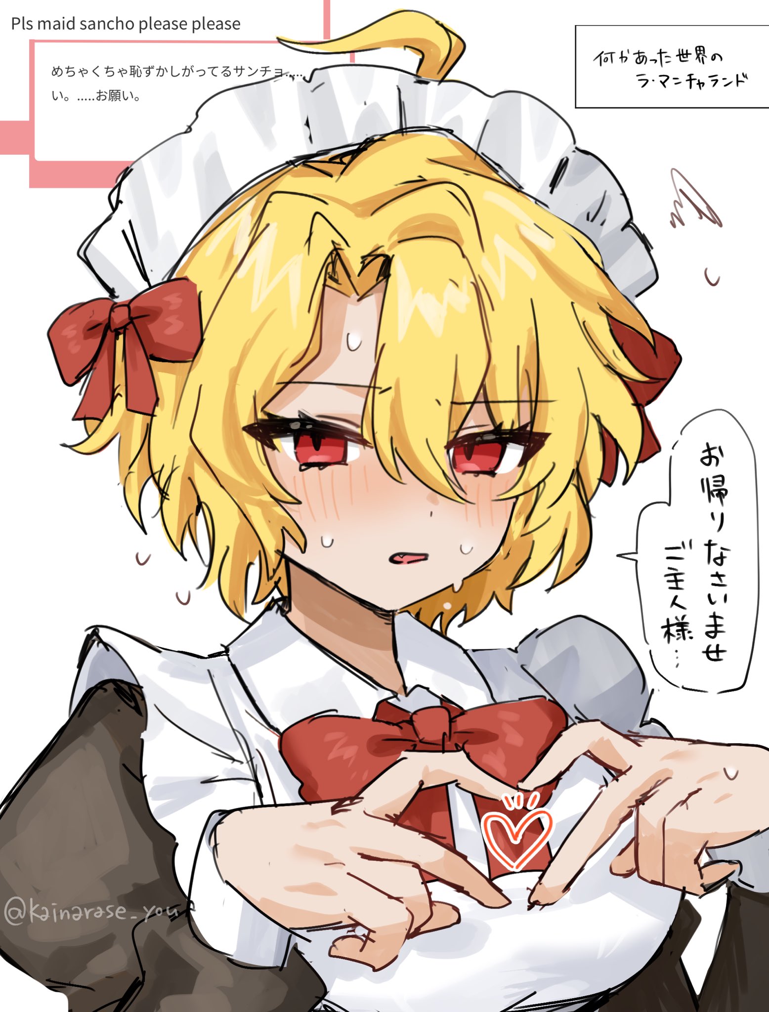 1girl apron blonde_hair blush bow don_quixote_(project_moon) frills heart heart_hands highres limbus_company maid maid_apron maid_headdress open_mouth parted_bangs project_moon puffy_sleeves red_eyes ribbon ro/ku sancho_(project_moon) solo white_apron